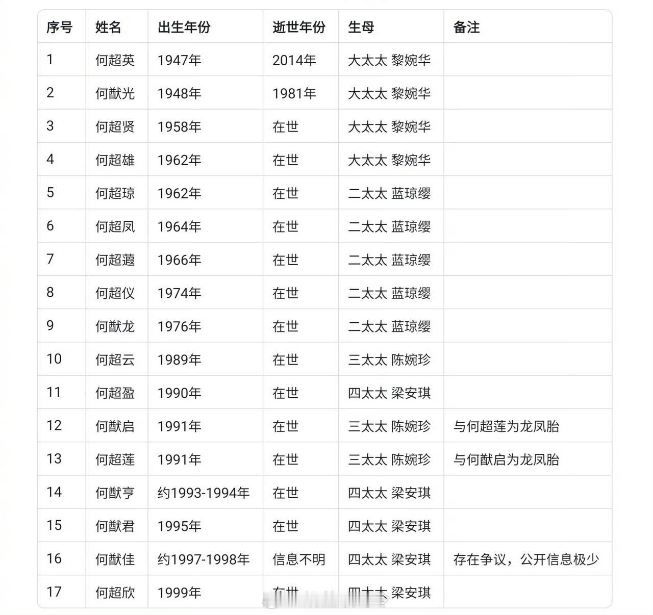 其母为二房蓝琼缨,2022年6月11日,也是因癌症在养和医院辞世的,享年79岁。蓝琼缨祖籍广东梅州大埔(客家),祖父蓝荫南:少将。父亲蓝建仪:抗日军人,后经商。1958年与何鸿燊结婚(当时香港仍允许纳妾),二人相识于中秋慈善晚会,以舞技惊艳,与赌王并称“舞帝舞后”。被称为赌王家族的“甄嬛”,低调但掌控全局。二房最终掌控:信德、澳博、新濠、美高梅中国等核心资产。