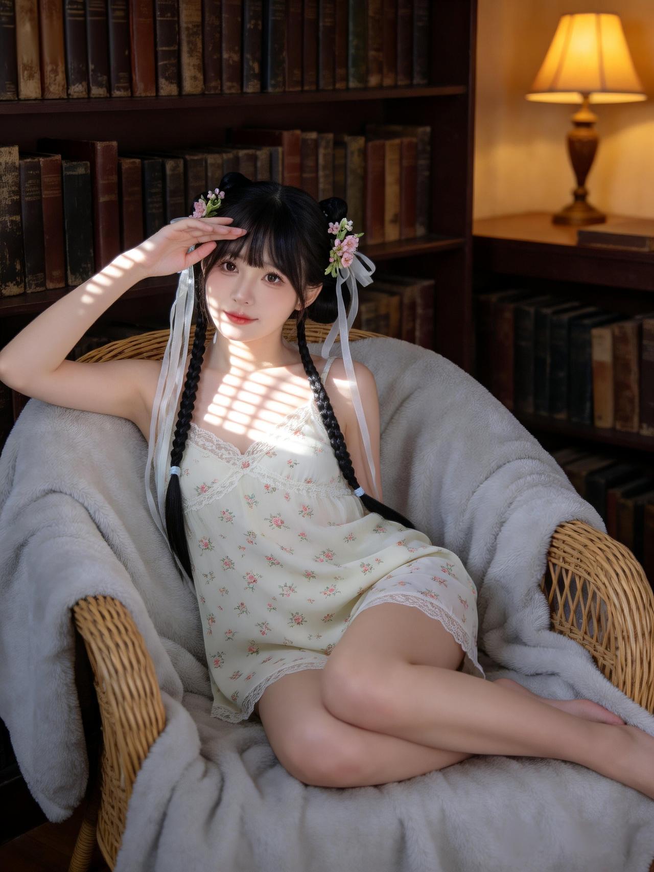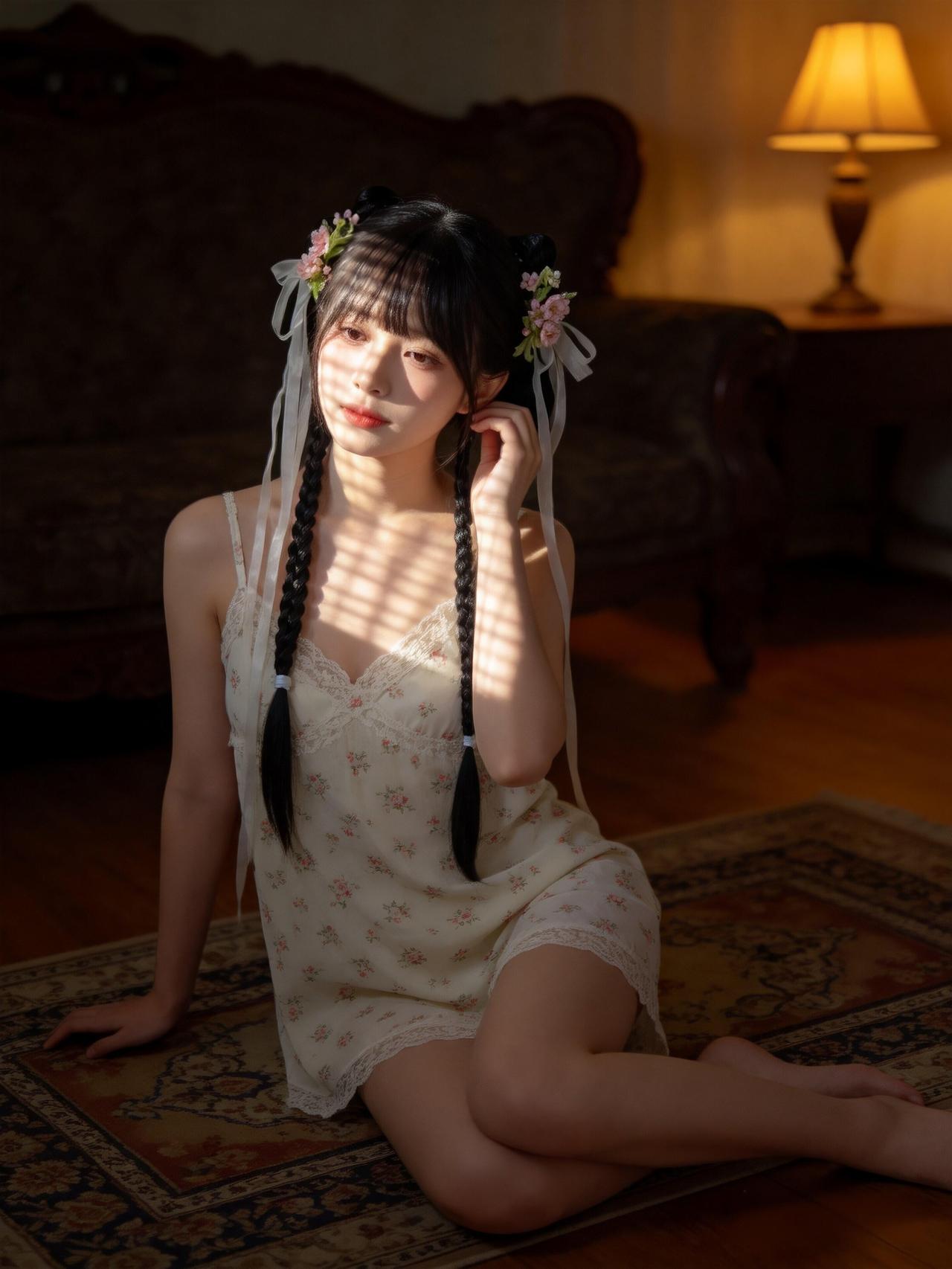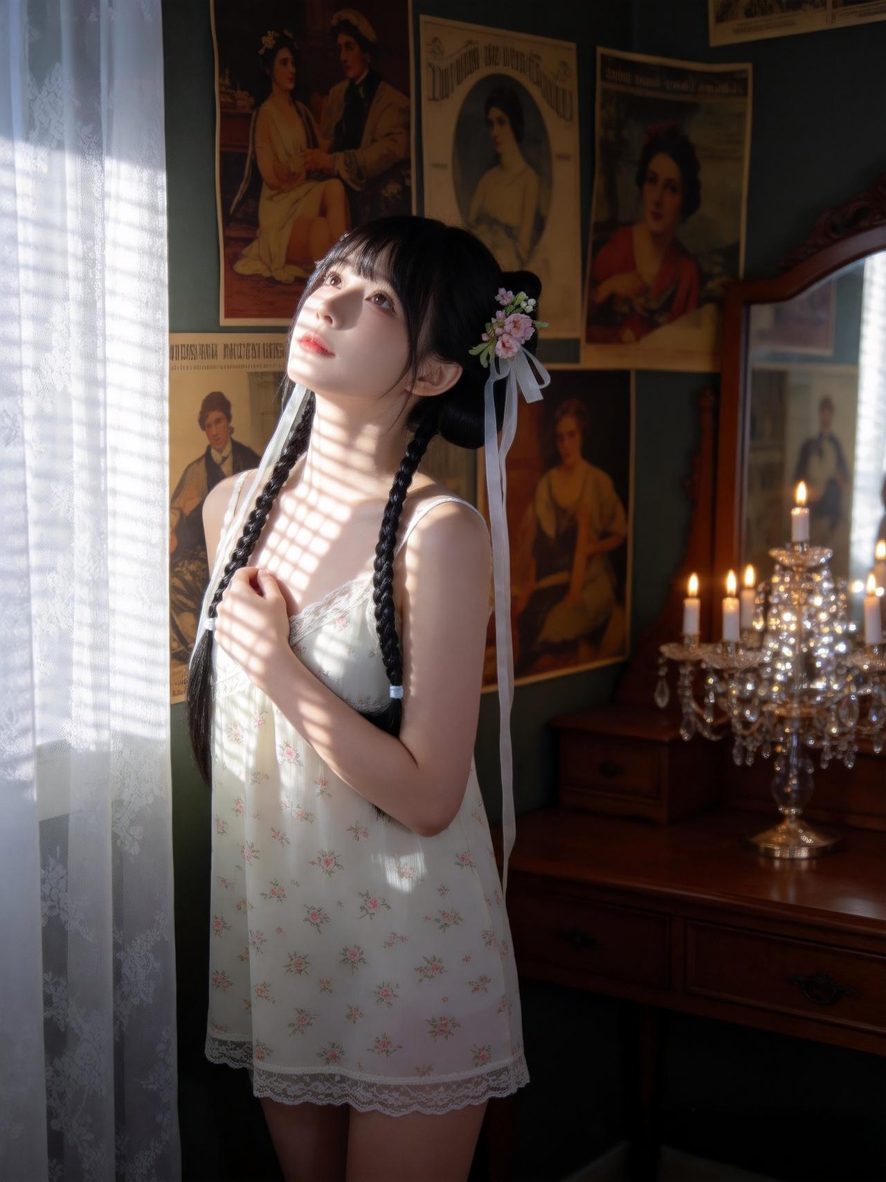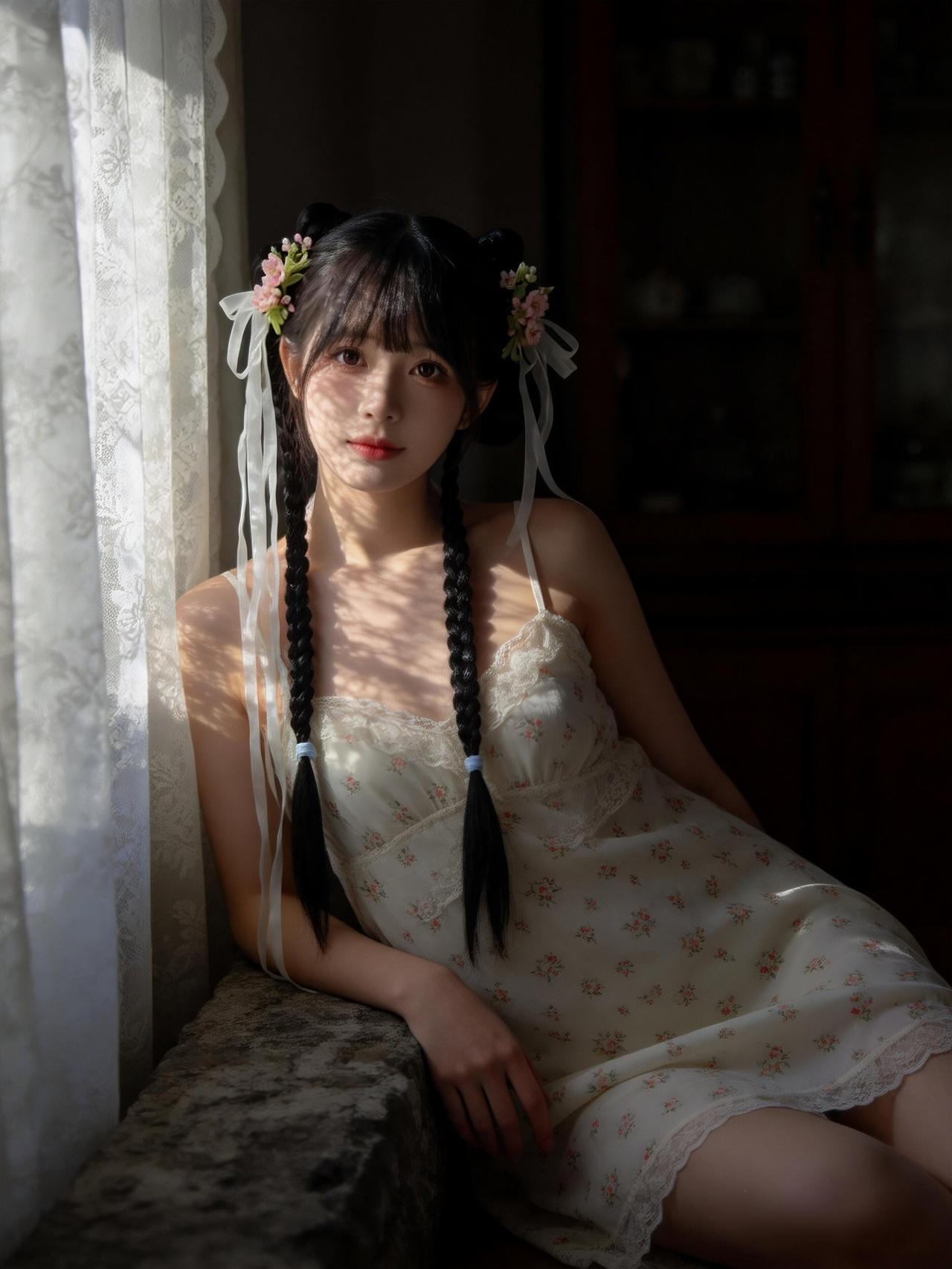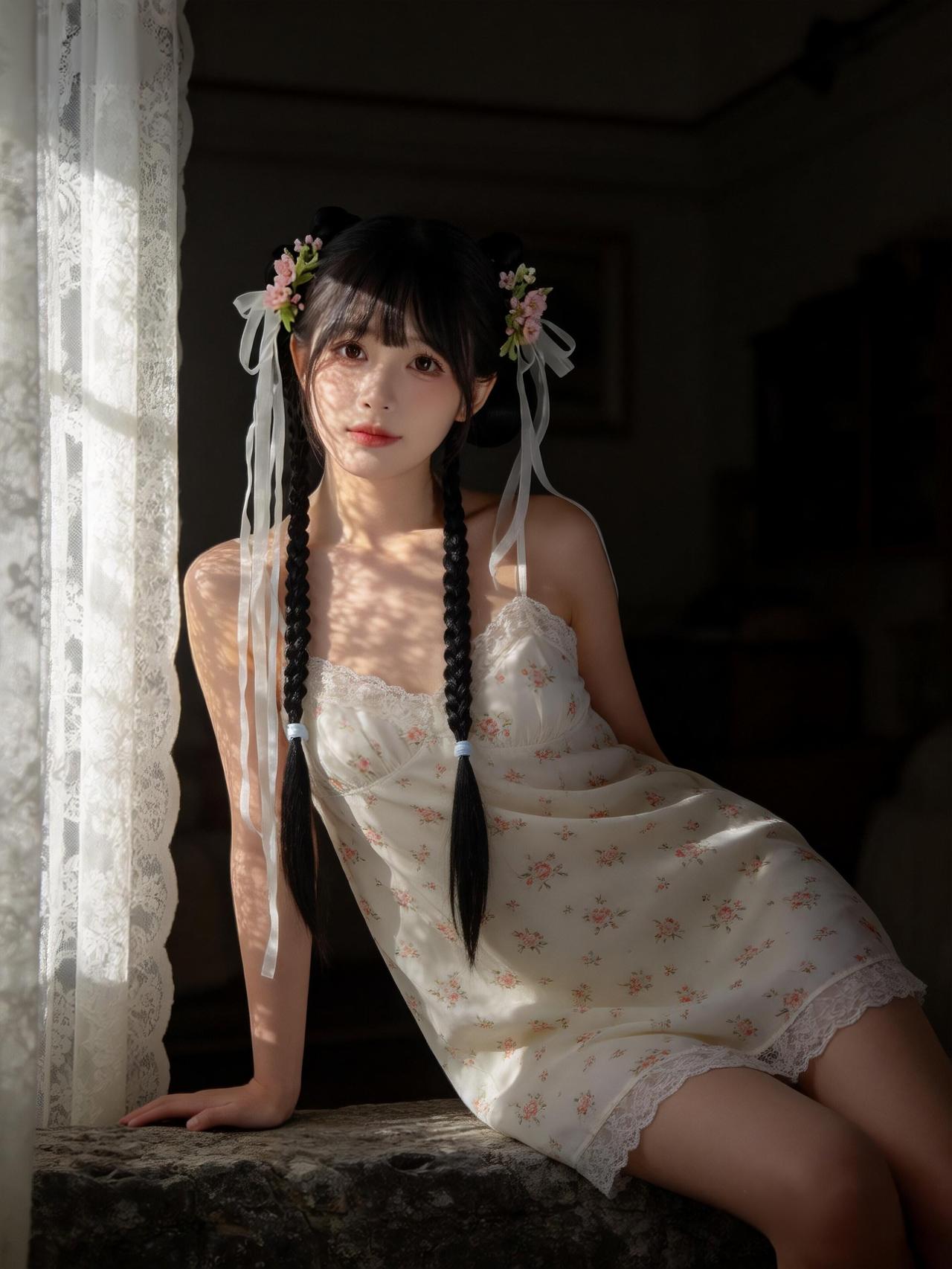 造型与光影的适配堪称完美:双麻花辫的垂坠感、发间花饰的点缀,在光影下层次分明;碎花睡裙的蕾丝领口与裙摆,在光斑中呈现出细腻的纹理,薄纱面料的通透感被光影放大,让人物仿佛从旧时光中走来。背景做了极致的虚化处理,仅保留蕾丝窗帘的轮廓,彻底消除了环境干扰,让所有视觉重心都落在人物的神态与光影上。