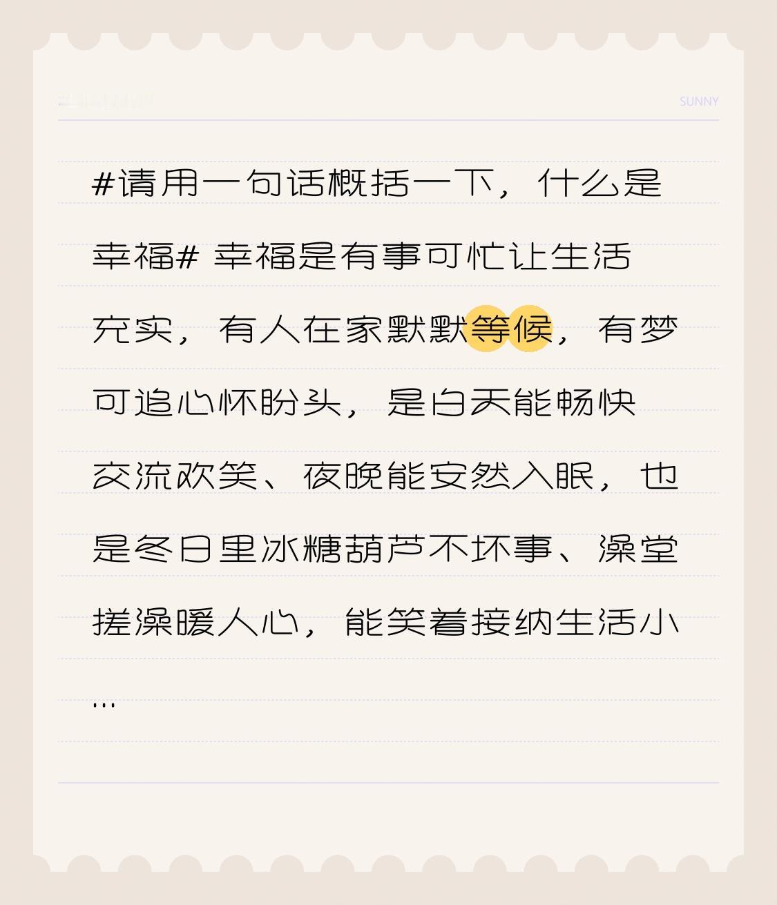 幸福是有事可忙让生活充实,有人在家默默等候,有梦可追心怀盼头,是白天能畅快交流欢笑、夜晚能安然入眠,也是冬日里冰糖葫芦不坏事、澡堂搓澡暖人心,能笑着接纳生活小波折,体检小恙不纠结,外卖上门超惊喜,雪天宅家享温暖。