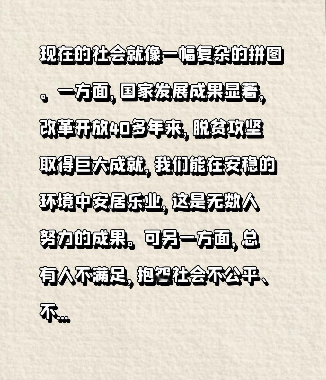 社会心态是会变化的,在发展关键期,出现一些问题很正常。我们应该客观看待,知足常乐,珍惜当下的生活,一起为更美好的未来努力。