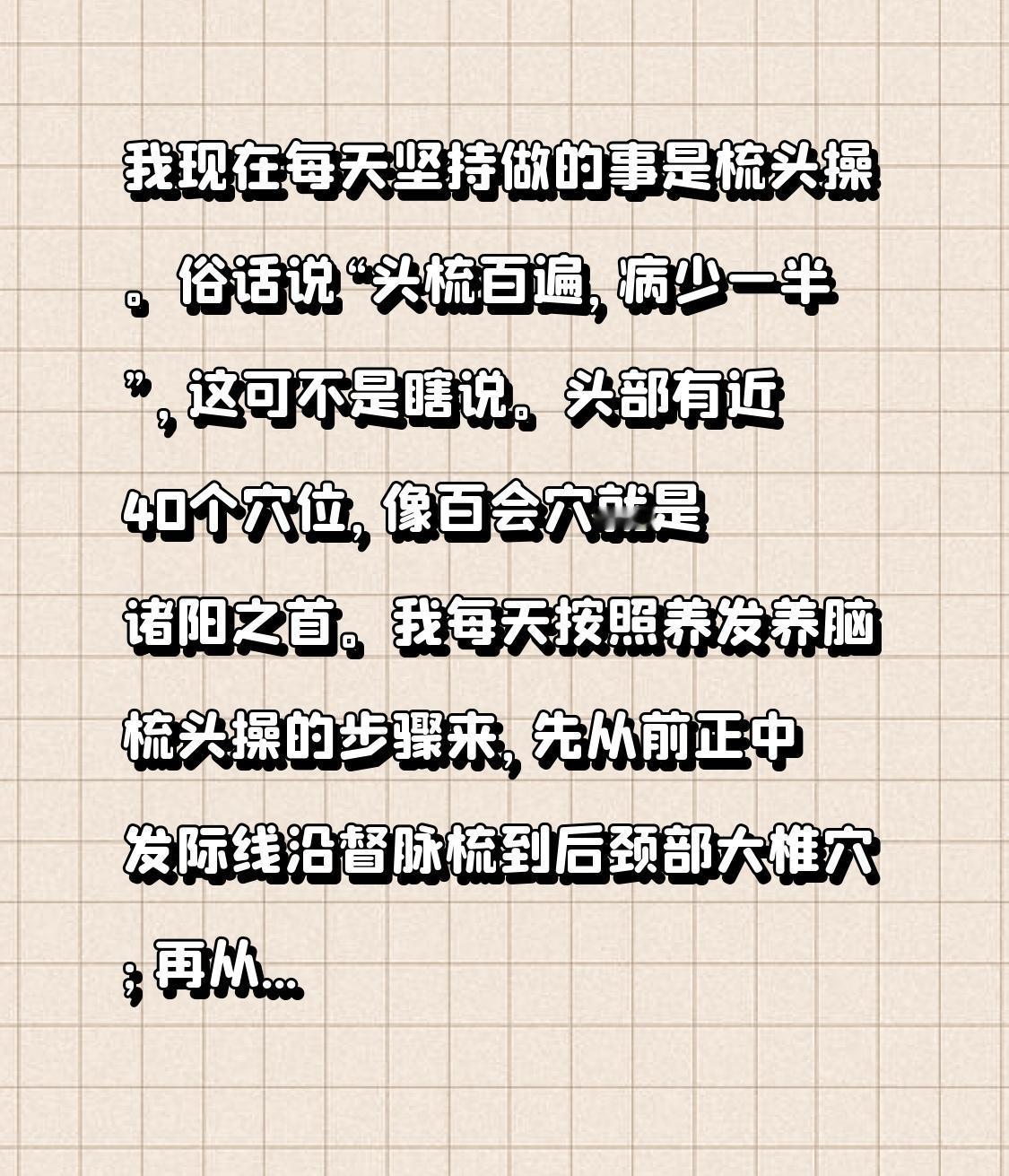 我现在每天坚持做的事是梳头操。俗话说“头梳百遍,病少一半”,这可不是瞎说。头部有近40个穴位,像百会穴就是诸阳之首。