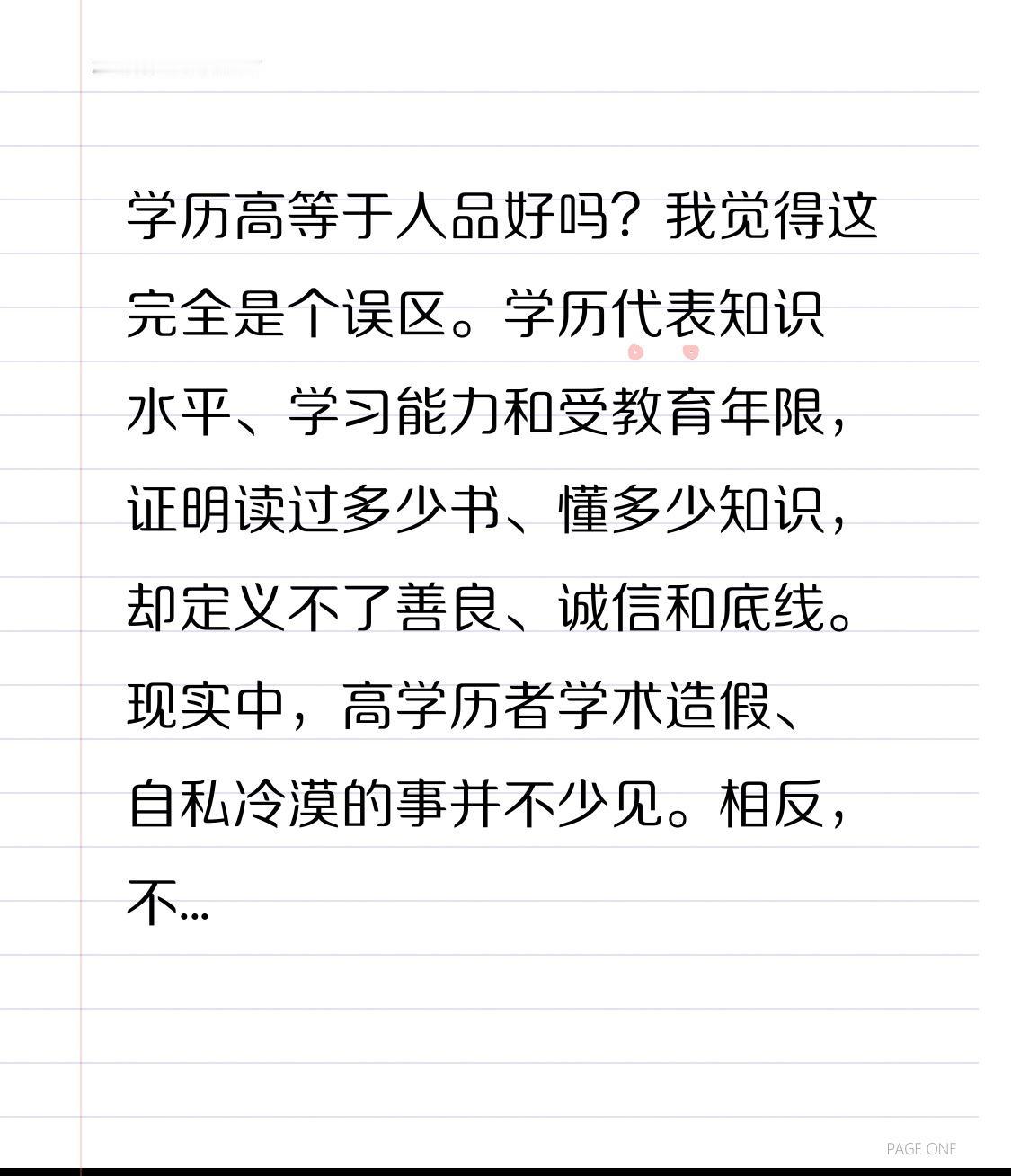 学历高等于人品好吗?我觉得这完全是个误区。学历代表知识水平、学习能力和受教育年限,证明读过多少书、懂多少知识,却定义不了善良、诚信和底线。