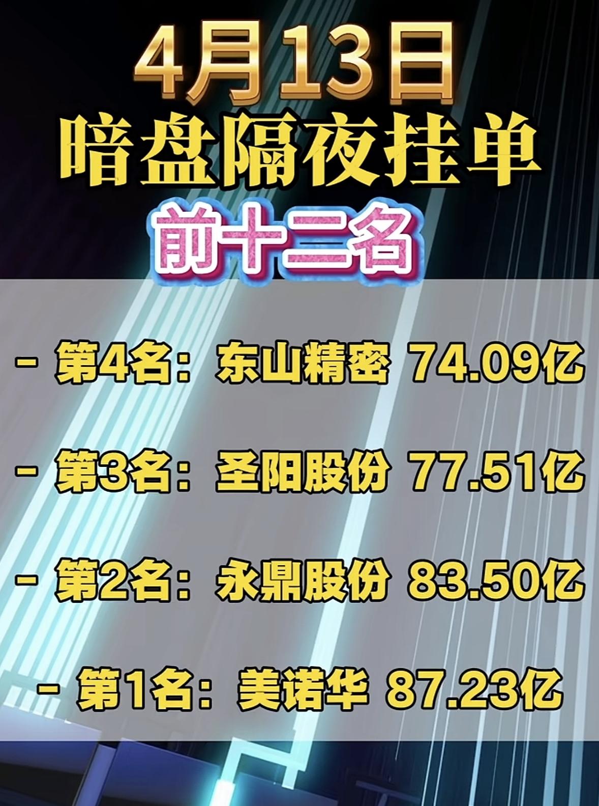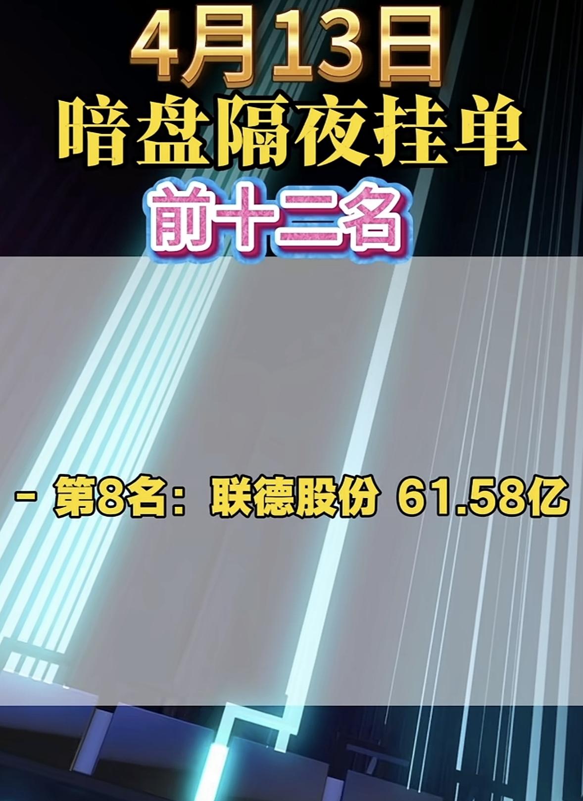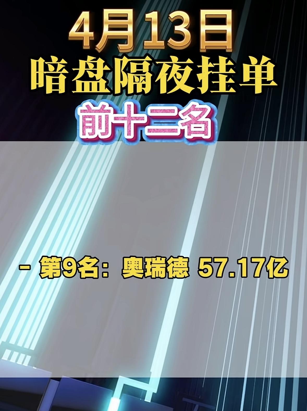4月13日周一暗盘隔夜挂单榜前十二名出炉。