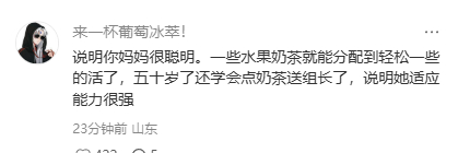 妈妈快50岁了,在厂里打工,今天听她说,她有时候会给组长点奶茶,买水果,女儿知道