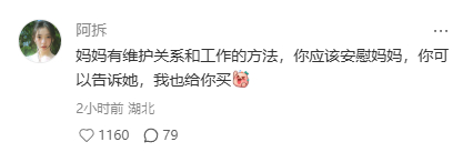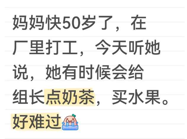妈妈快50岁了,在厂里打工,今天听她说,她有时候会给组长点奶茶,买水果,女儿知道后好难过。