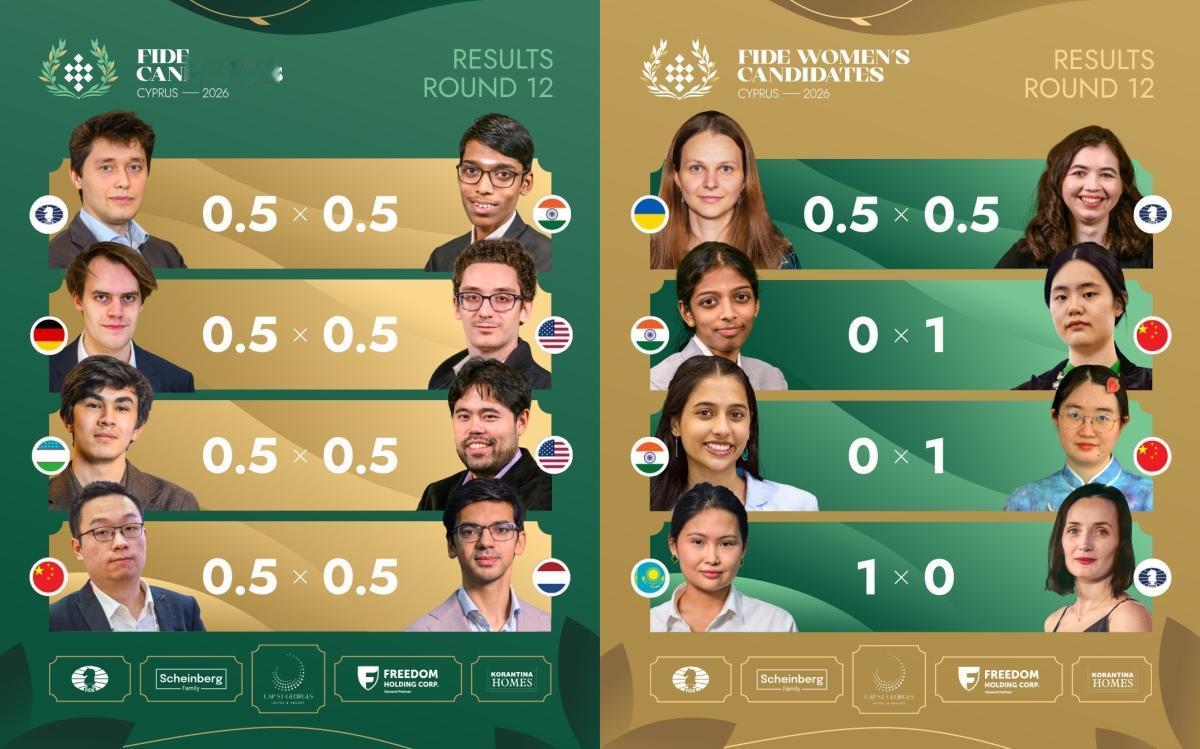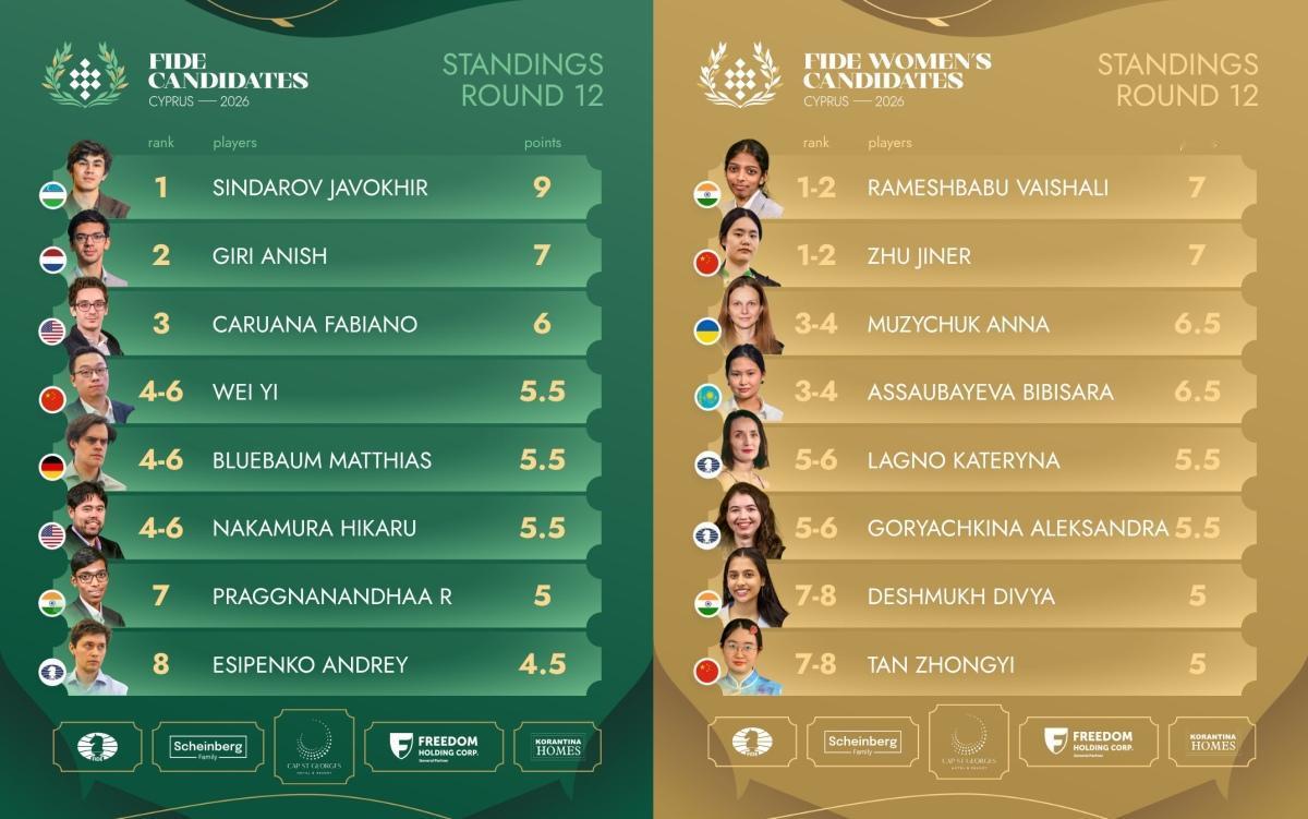 4月12日,2026年国象世界冠军候选人赛战罢第12轮,朱锦尔、谭中怡分别击败瓦伊莎莉、德什穆克。朱锦尔和瓦伊莎莉同积7分,并列积分榜第一名。 男子组,辛达罗夫积9分,下一轮战平即可提前一轮夺得候选人资格。