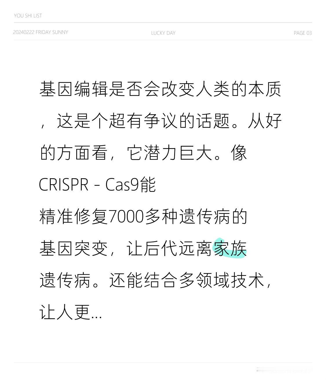 基因编辑是否会改变人类的本质,这是个超有争议的话题。从好的方面看,它潜力巨大。像CRISPR - Cas9能精准修复7000多种遗传病的基因突变,让后代远离家族遗传病。还能结合多领域技术,让人更聪明、健壮,趋近“完美”生命状态。