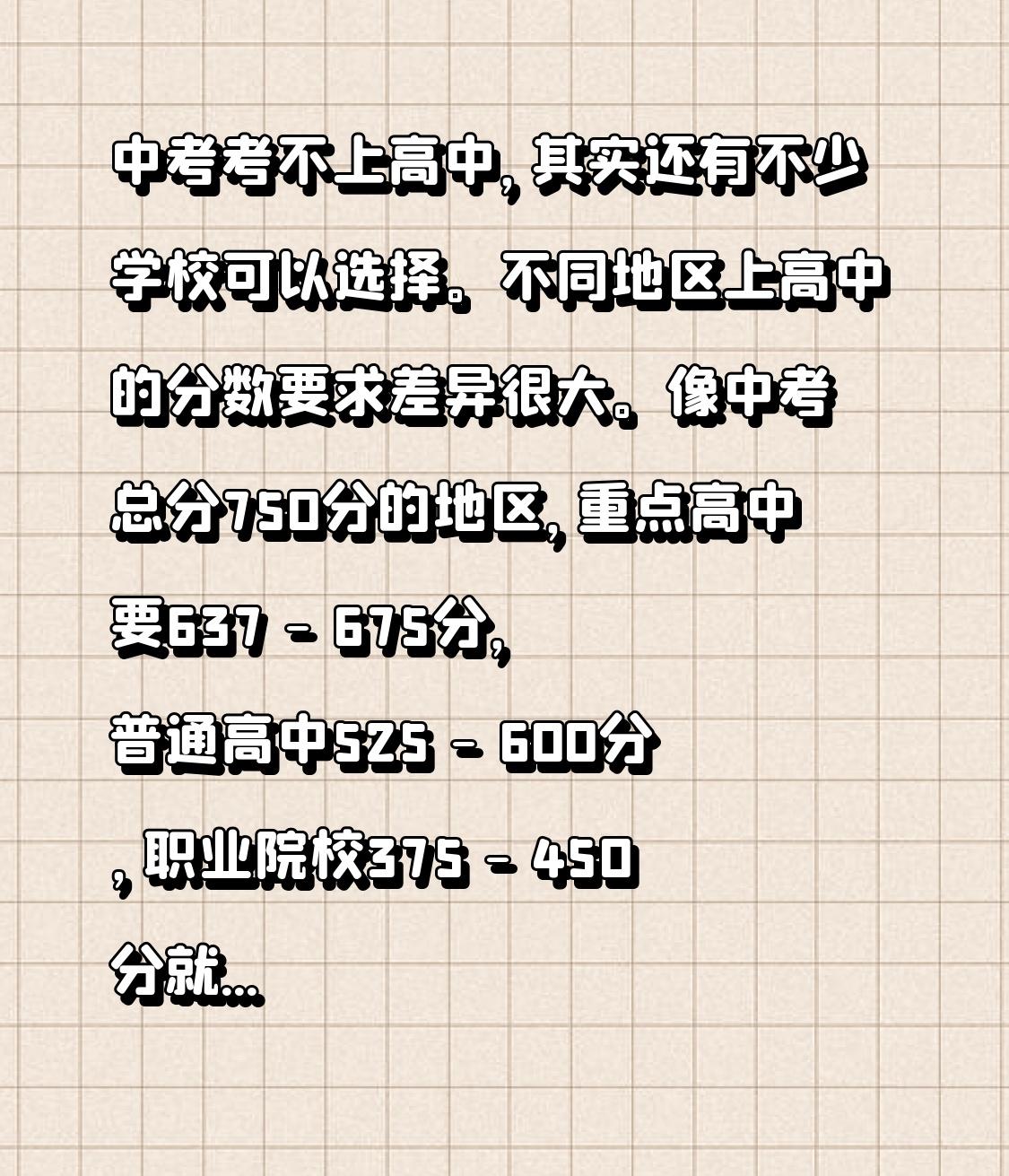 中考考不上高中,其实还有不少学校可以选择。不同地区上高中的分数要求差异很大。像中考总分750分的地区,重点高中要637 - 675分,普通高中525 - 600分,职业院校375 - 450分就行。在北京、上海等竞争激烈地区,重点高中600分以上,普通公立高中500多分;而有些地区350分也有机会上高中,比如西安普高最低控制线539分,广州普高最低控制线545分。