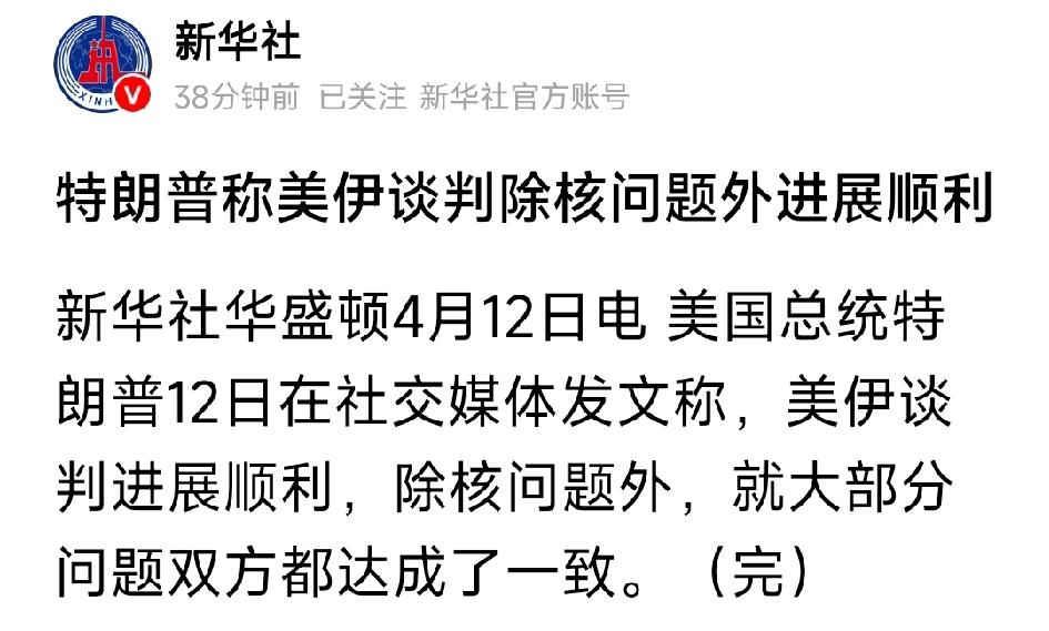 美国总统特朗普在社交媒体发文称,美伊谈判进展顺利,除核问题外,就大部分问题双方都达成了一致。看来,特朗普高强度打不愿意,谈判不愿意谈拢,停战也不愿意。目的就是封锁伊朗经济,持续让地区动荡油价高升,从中牟利。真不敢相信堂堂世界第一强国的总统,这个德性,老美国运真的到头了。