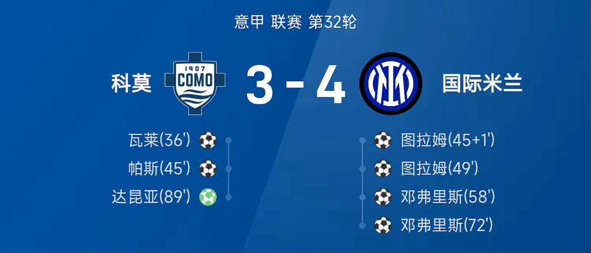 意甲联赛国际米兰国米4-3科莫图拉姆梅开二度邓弗里斯双响意甲争冠