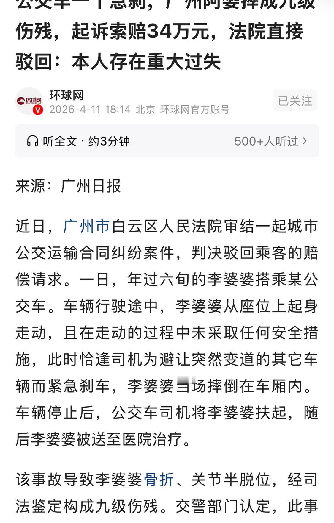 广州,6旬老太坐公交,期间坐累了,就起身在车厢过道里走动,活动腿脚。谁知,司机避让前方突然变道车辆,不得已紧急踩刹车,导致老太当场摔倒在车厢内,疼得呲牙咧嘴,起不来了。司机赶紧将车停稳,将老太扶起,并送去就医。结果,老太确诊为骨折、关节半脱位,构成了九级伤残。老太花钱又招罪,认为都是司机的责任。于是,将司机和公交公司一并告上法庭,要求赔偿医药费等34万元,法院判决很意外。