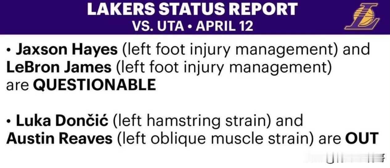 湖人伤病情况:詹姆斯/海斯出战成疑,都是左脚伤病管理;东契奇和里夫斯继续缺阵。