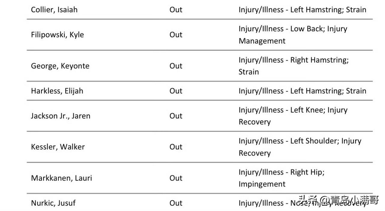 爵士伤病情况:目前爵士有8名球员确定缺阵,分别是科利尔、菲利波夫斯基、基扬特-乔治、哈克莱斯、贾伦-杰克逊、凯斯勒、马尔卡宁、努尔基奇。