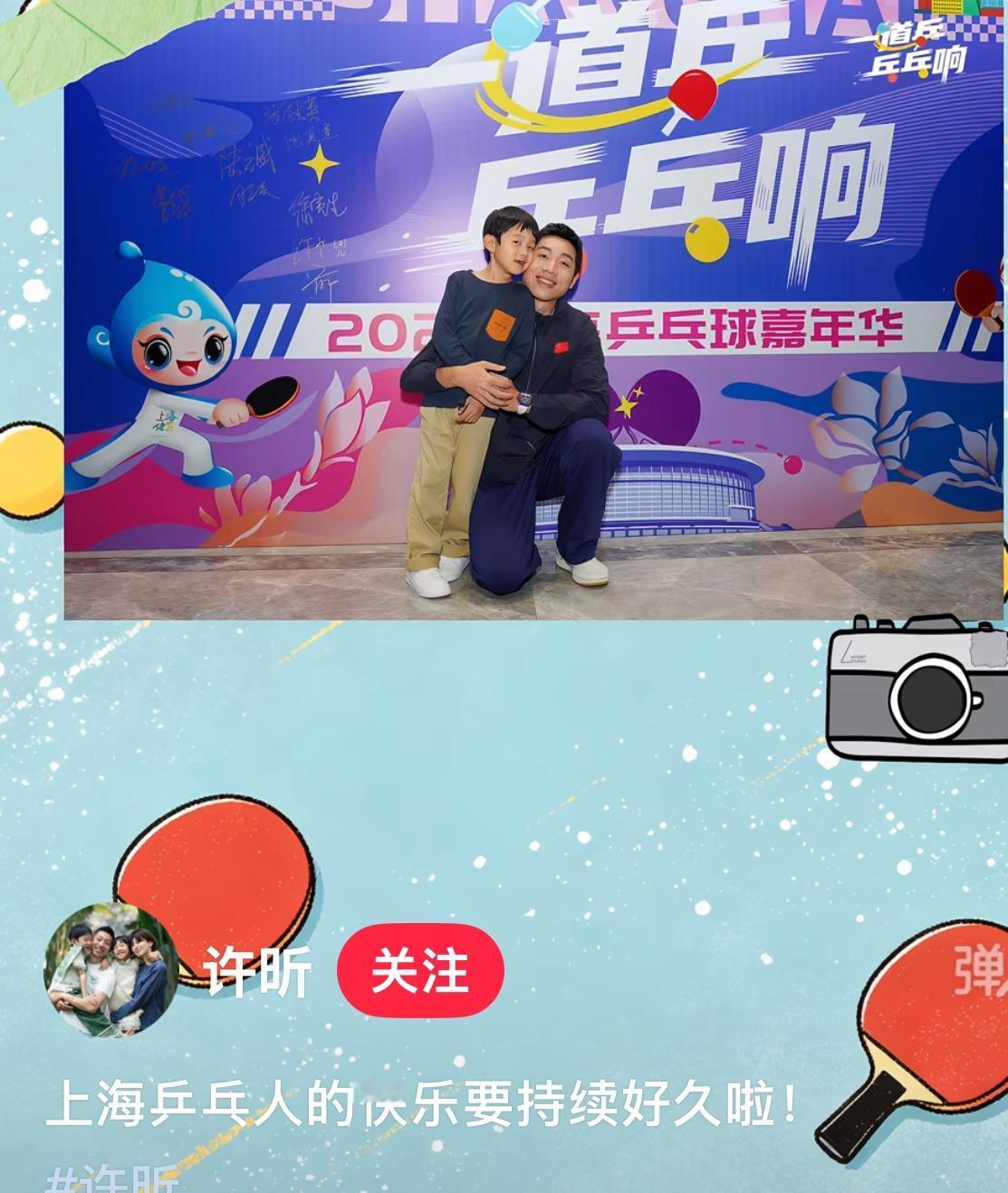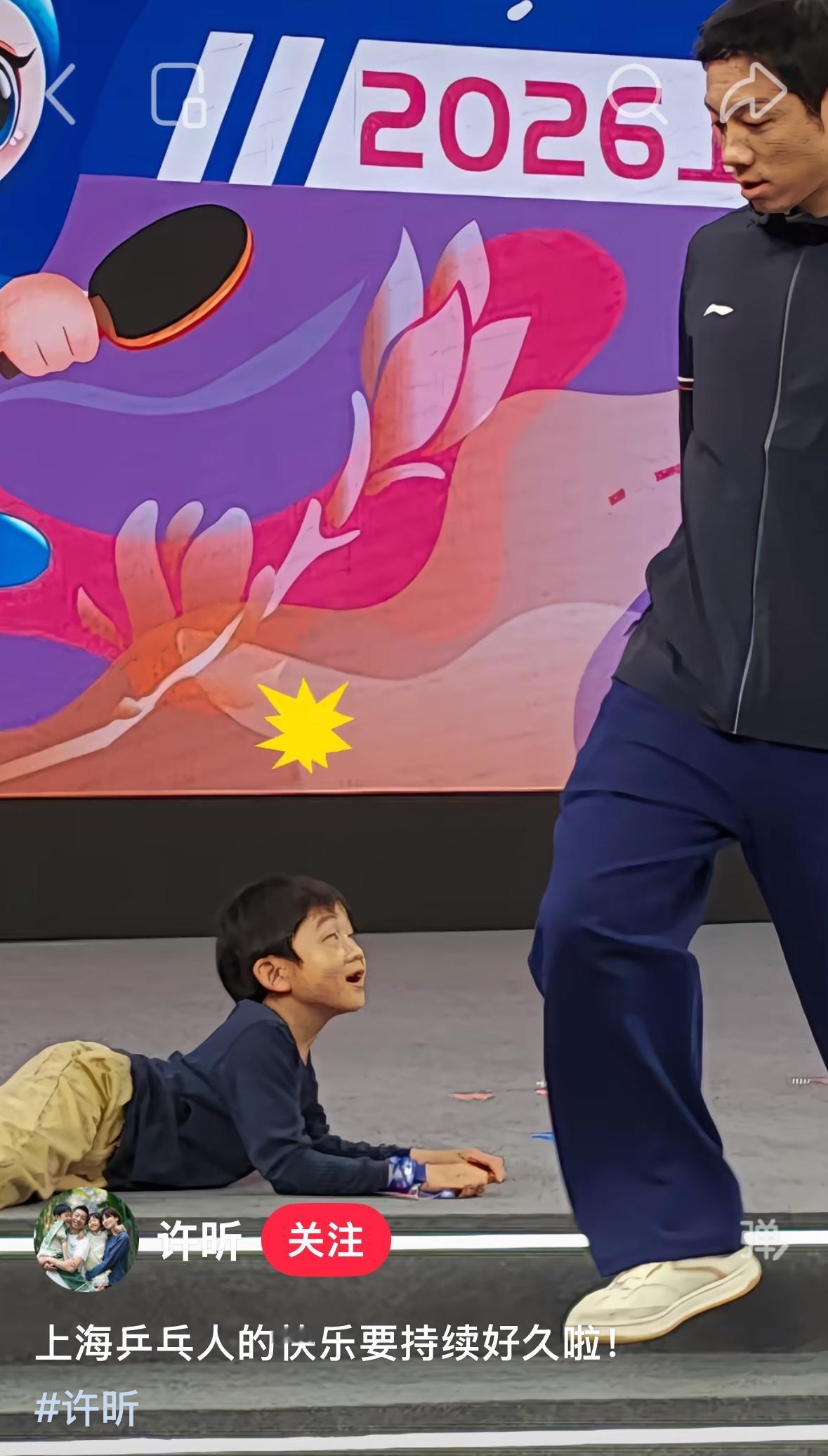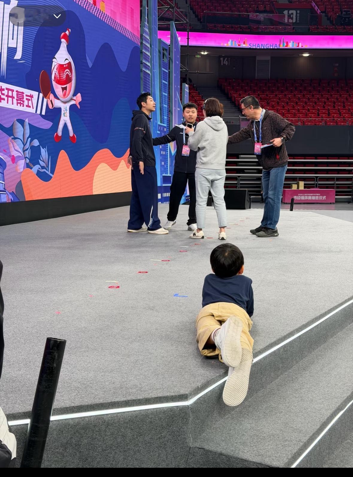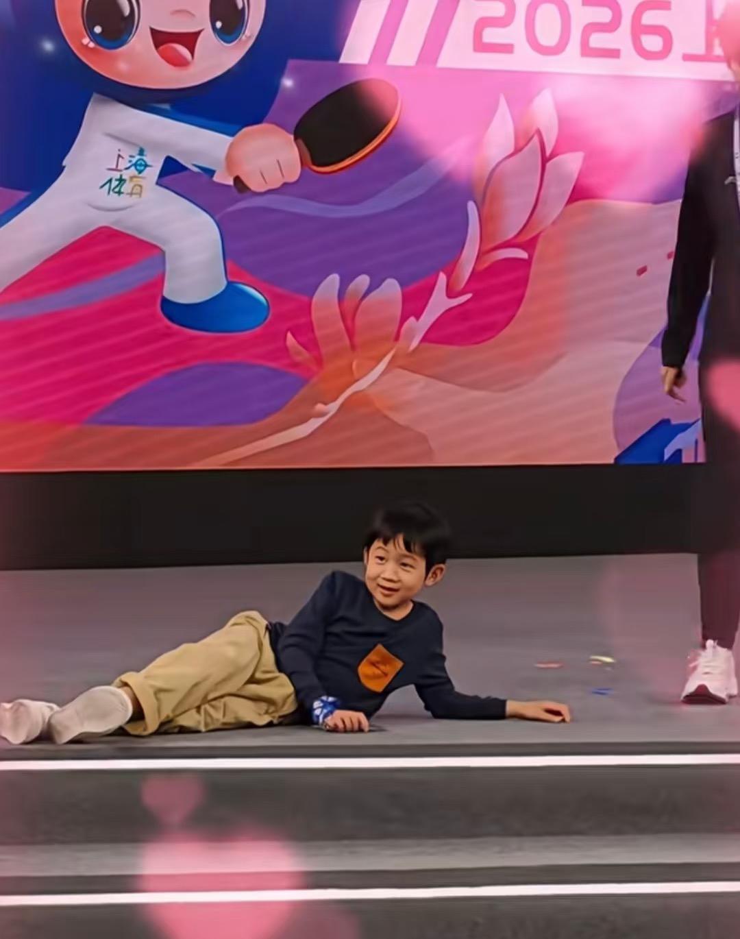 许昕更新:上海乒乓人的快乐要持续好久啦! 许昕的儿子卡卡趴在舞台边 好安逸,松弛