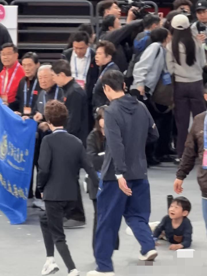 许昕的儿子卡卡趴在舞台边