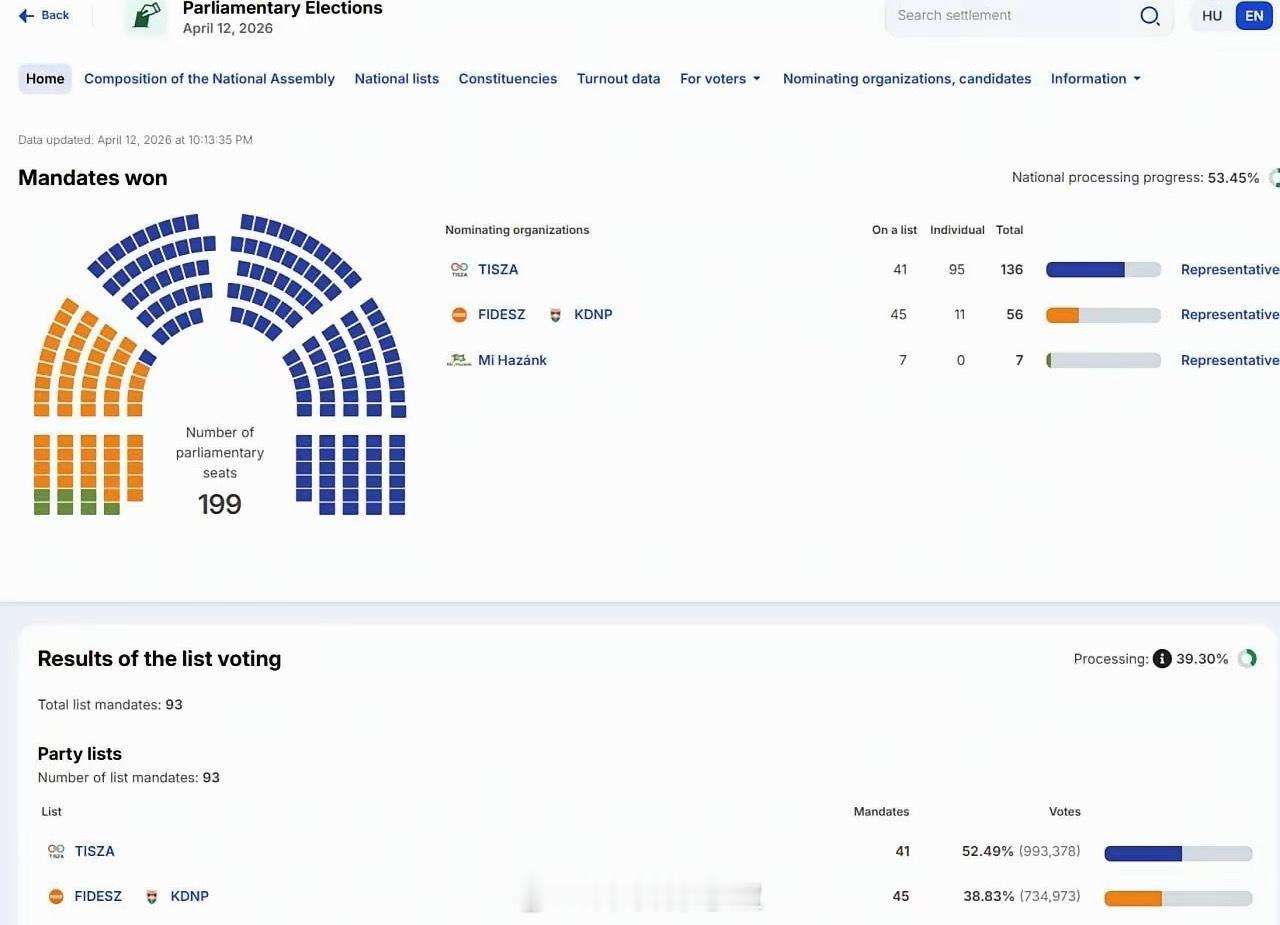欧尔班祝贺马亚尔获胜:蒂萨党在匈牙利议会选举中胜出匈牙利蒂萨党领袖彼得·马亚尔表示,他已接到欧尔班的来电,欧尔班在电话中祝贺他在匈牙利议会选举中获胜。匈牙利议会选举已统计 53.4% 选票。蒂萨党已锁定议会中超过三分之二席位,达到 136席。欧尔班称选举结果已经明朗,青民盟将作为反对党继续为匈牙利服务。