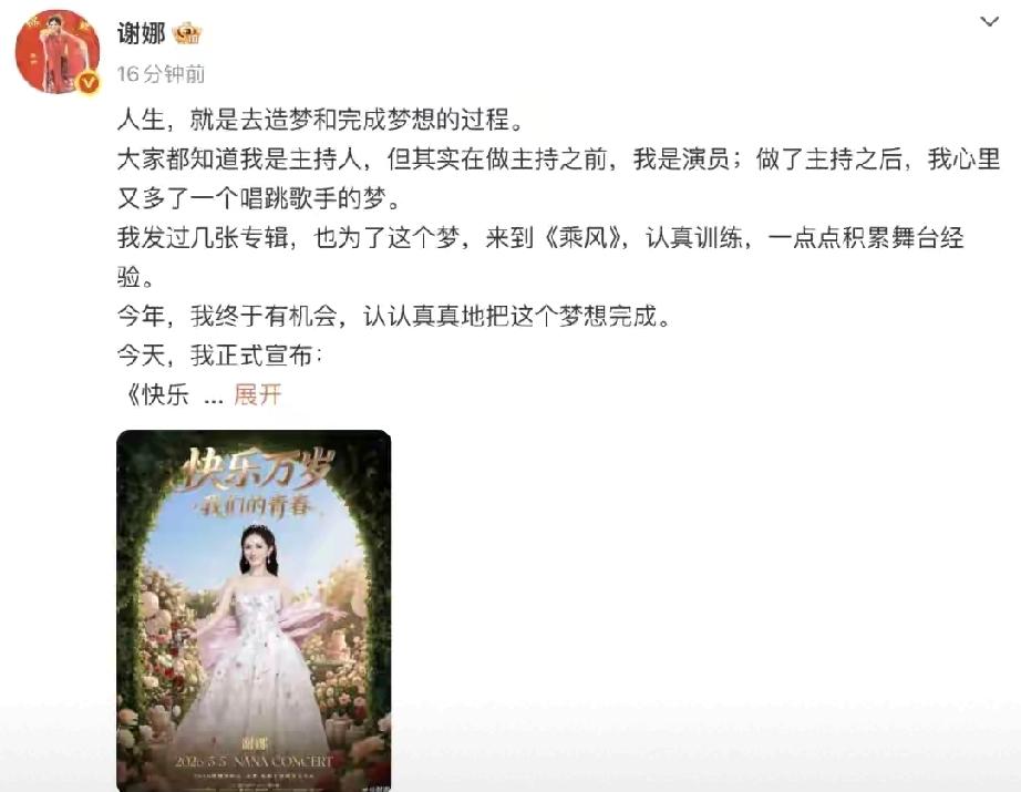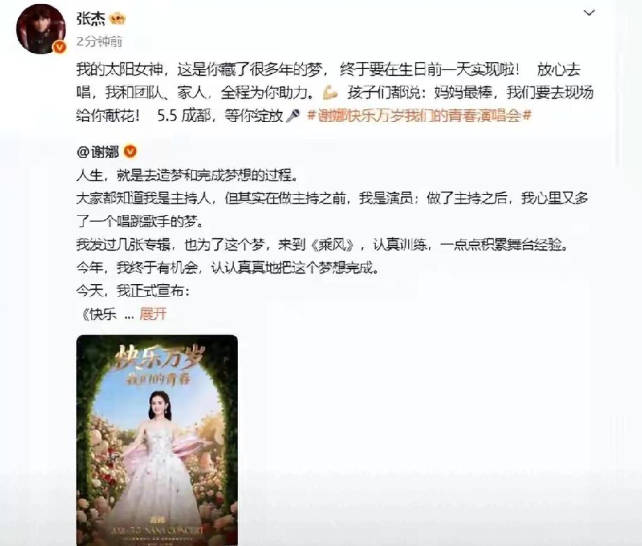 谢娜个人首场演唱会正式定档5月5日成都,圆了多年歌手梦。张杰暖心发文力挺:“放心去唱”,不仅亲自到场,还出动御用顶级演唱会团队全程兜底,舞美音响一手包办,更带孩子现场献花,全家保驾护航。