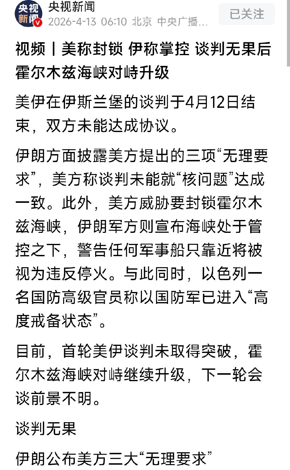 核问题是核心问题,美国不能搞双重标准,应该与四常一起坚定消除其它任何国家任何可能的核研发能力和机会,尤其日本和以色列。这样让有核的能互相监督,无核的不能有研核的想法,核问题是人类能否存在的问题。其它面就不算什么事。美国强行封锁霍尔木斯海峡是一个更愚蠢的决定,只会使自己陷入持久战泥潭更深更久更难受。特朗普一边佯装和谈,一边调集力量准备摧毁谈判对象。国家信用就是这样被特朗普蚕食的。