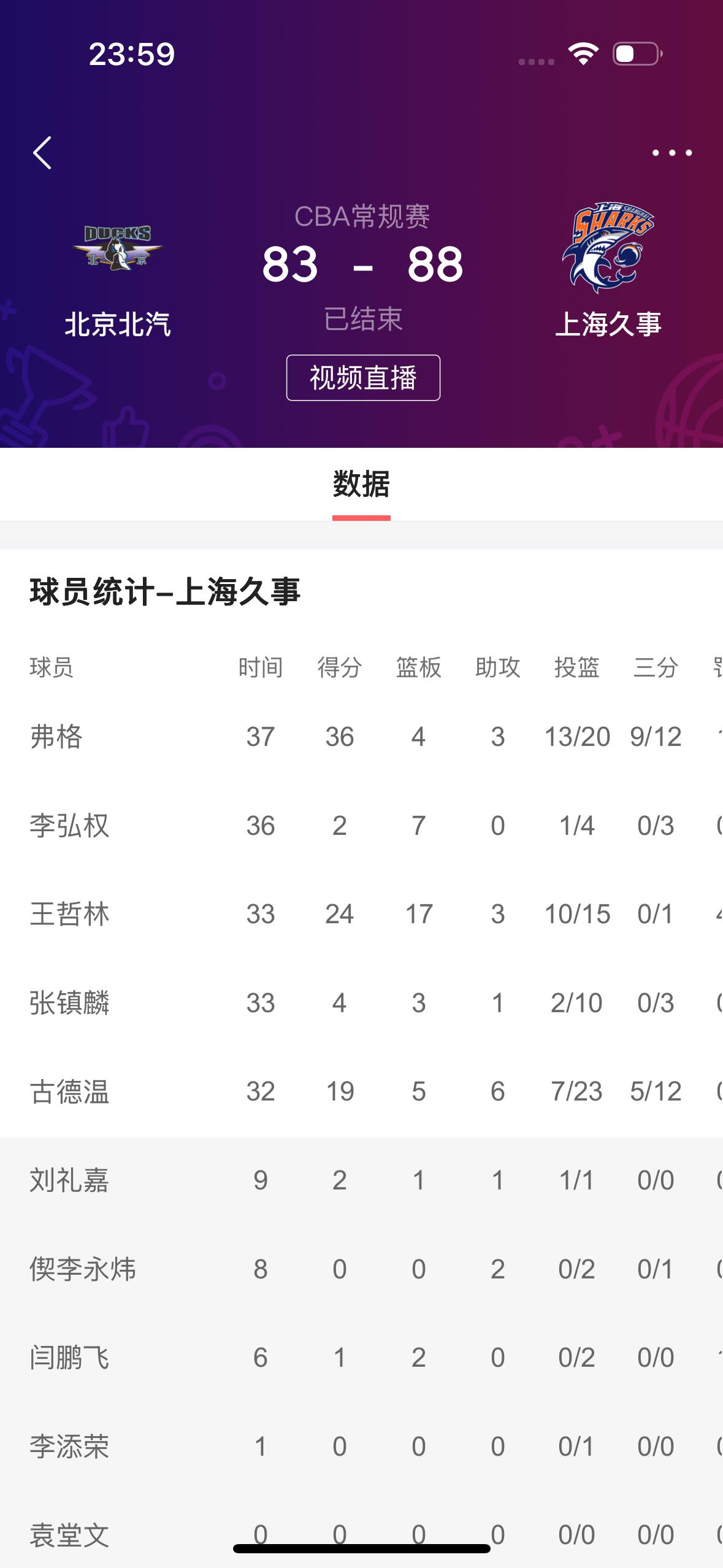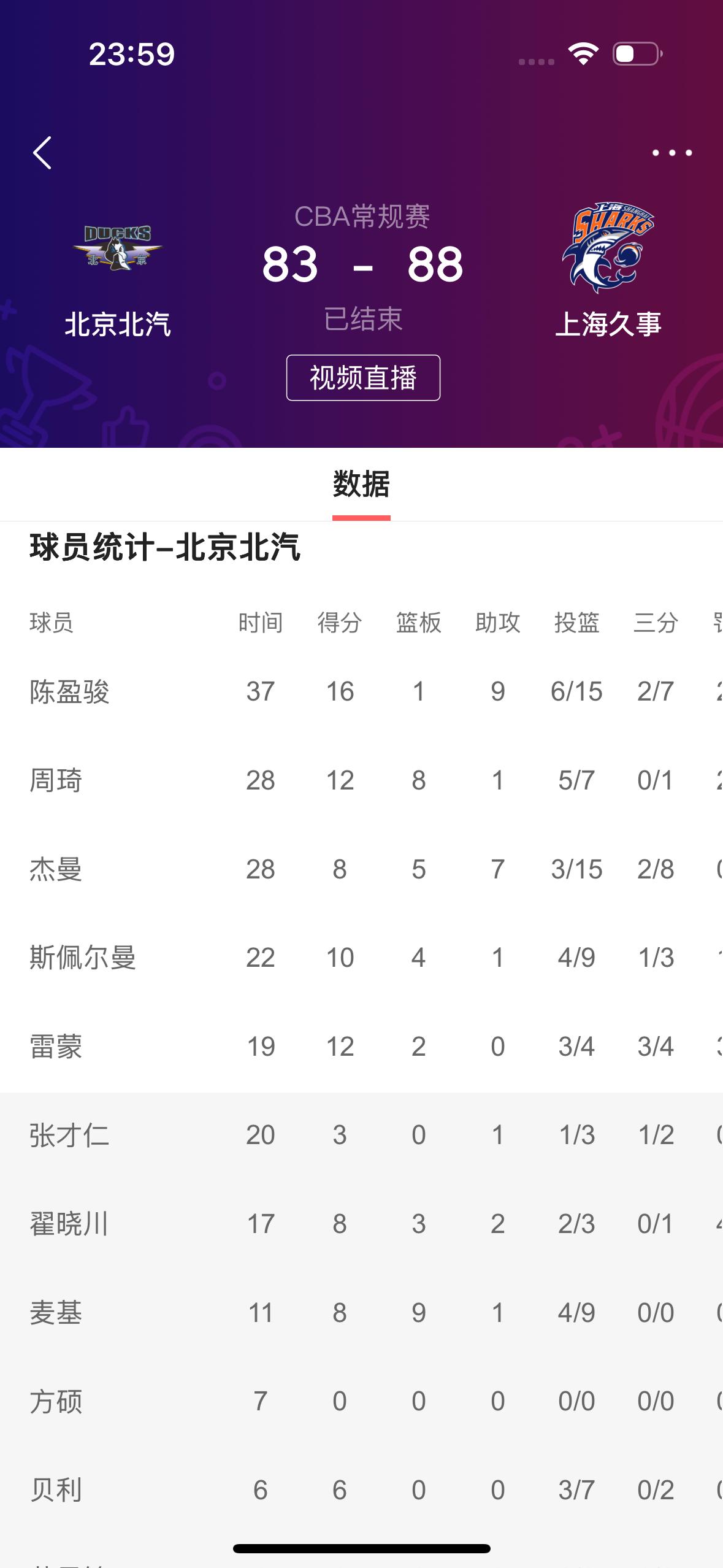 在昨天晚上大王所在的上海久事男篮以88比83客场战胜北京北汽男篮的比赛中: