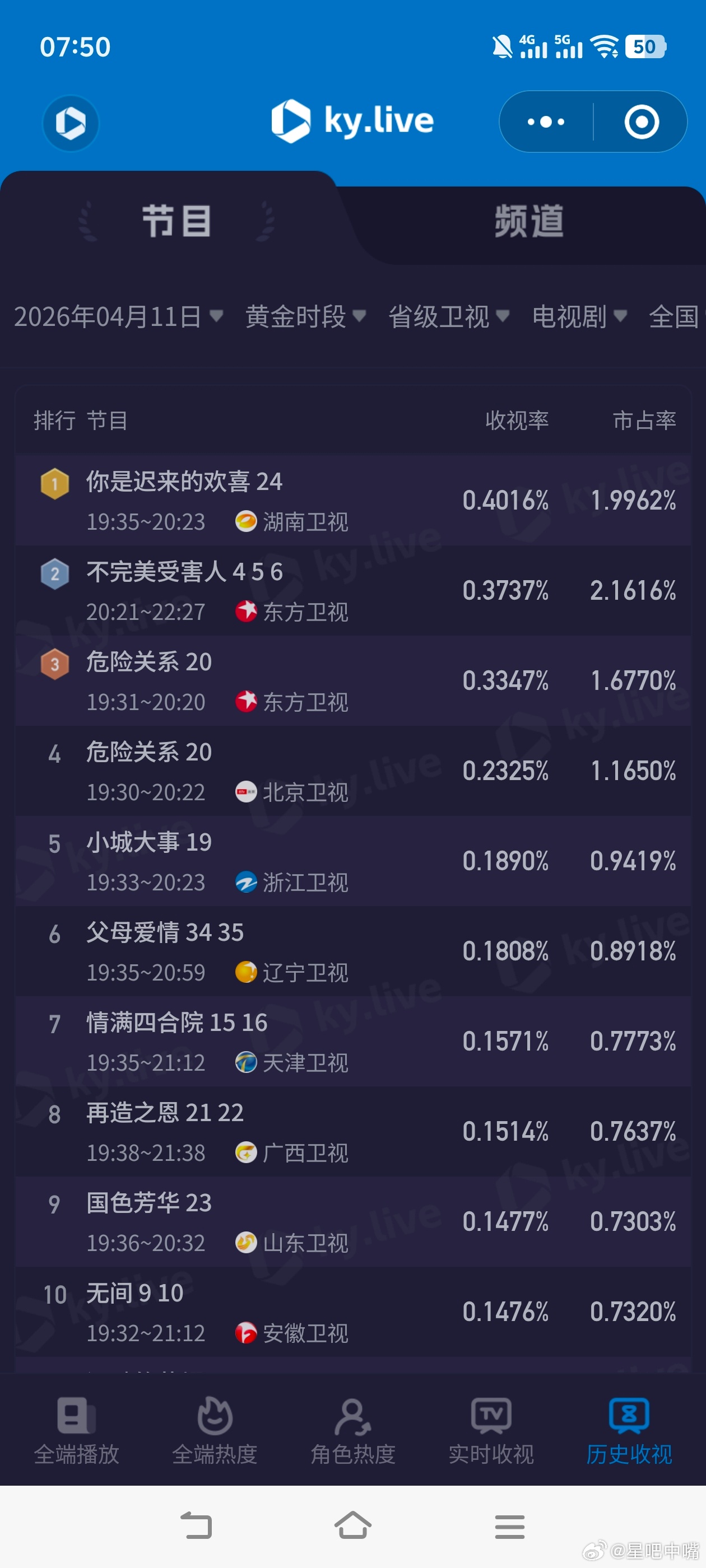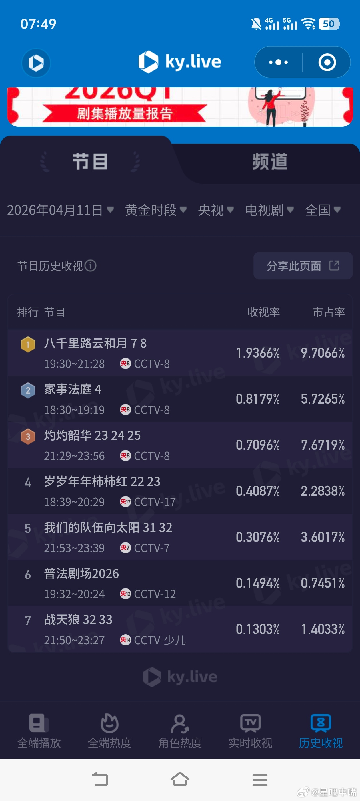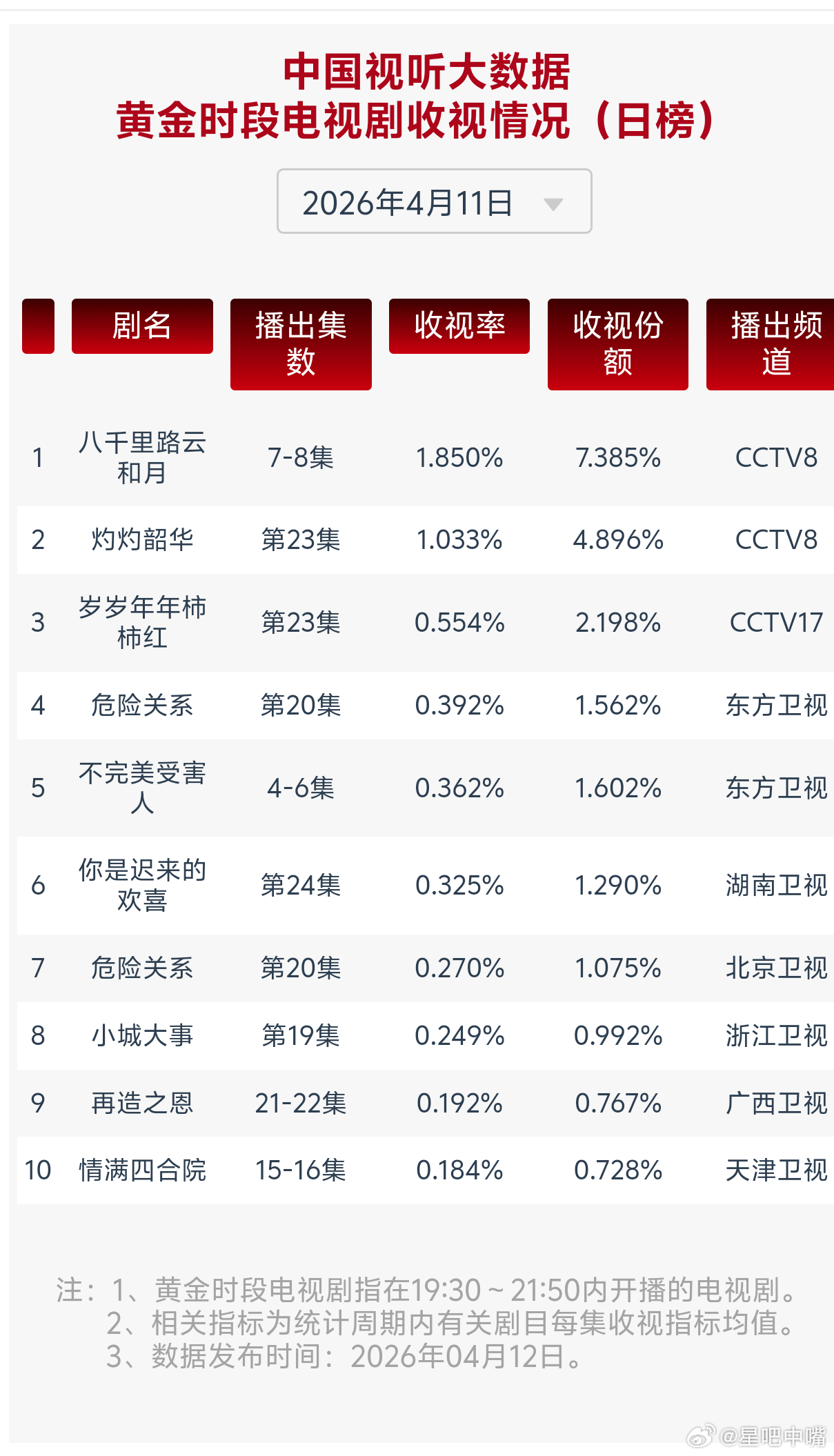 4月11日cvb收视日报!《八千里路云和月》1.850创新高!