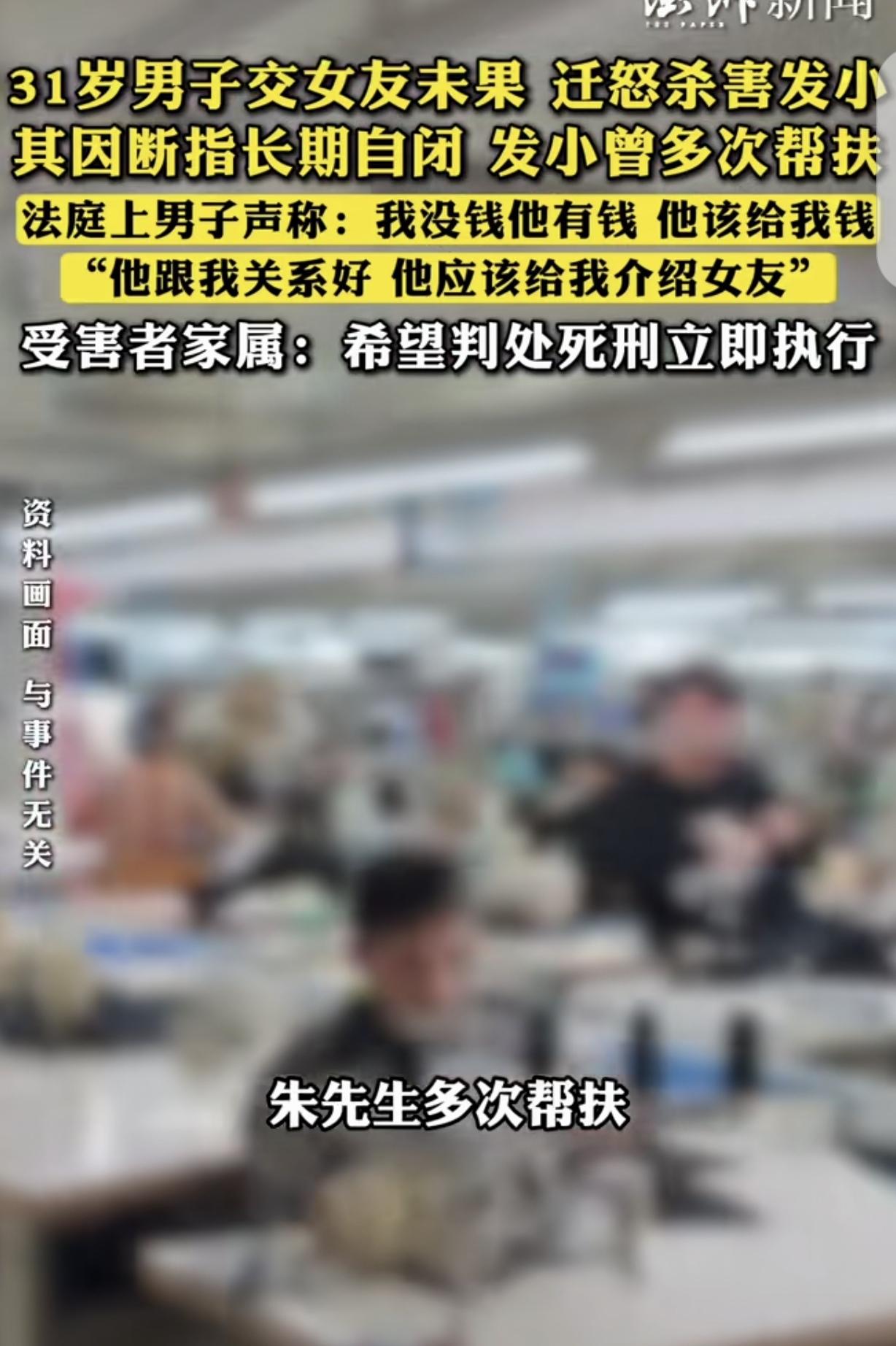 “升米恩斗米仇!”湖南岳阳,一31岁男子,儿时玩鞭炮被炸断手指自闭,30岁的发小心疼他,让他来自己服装厂上班,还承诺给他介绍女朋友,可男子女友没谈成,竟然恨上发小,拿自制钢珠发射器,把发小射杀在车库,法庭上,男子竟然大言不惭:他说给我介绍对象,还给我100万,我没钱他有钱,他该给我钱,他跟我关系好,应该给我介绍女友。发小家属:希望把他判处死刑,立即执行。
