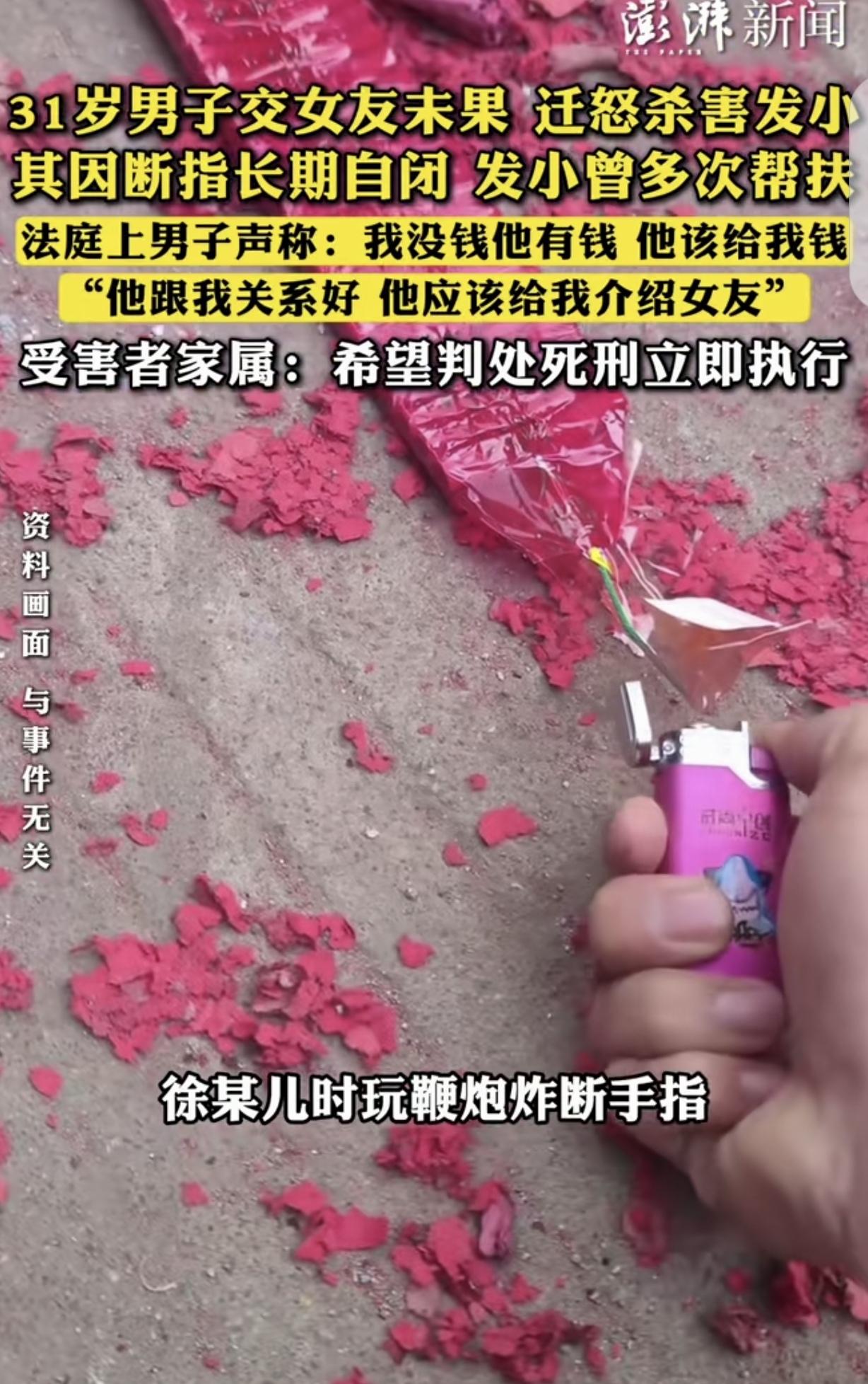 徐某小时候玩鞭炮炸断了手指,打那以后性格就变得特别内向,几乎没什么朋友,整天闷在家里。