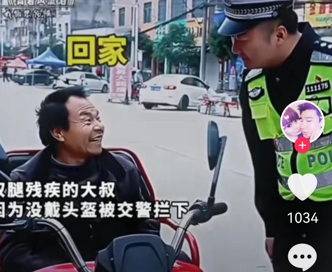 这个小视频火了,江西警察查违章,嘘寒问暖,聊了很多,问为什么不带头盔,他说买不起,于是警察送给残疾驾驶员一个头盔。