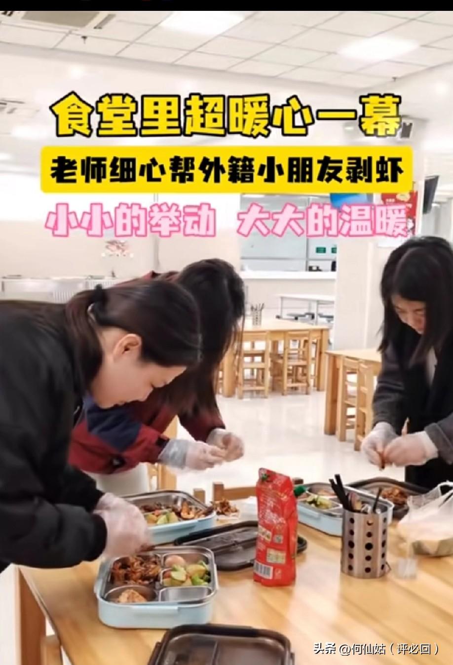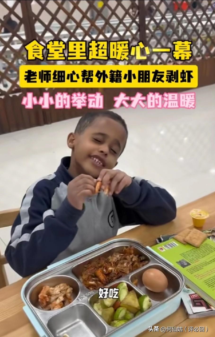 幼儿园老师给外籍娃剥虾的样子,暖到心尖发颤!