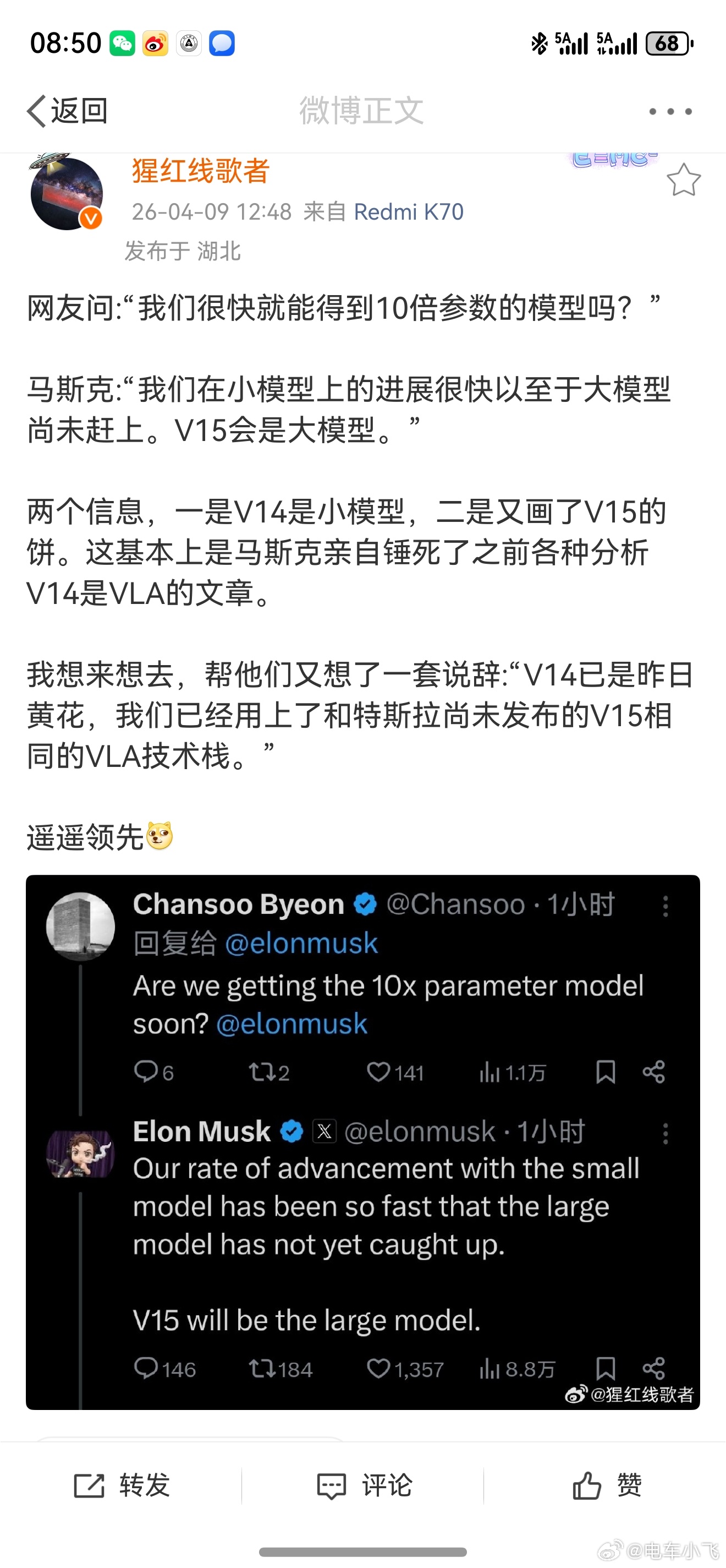 三一大哥的真知灼见犹在耳边回响。如今马斯克亲口承认v14是小模型也是给三一正名了!