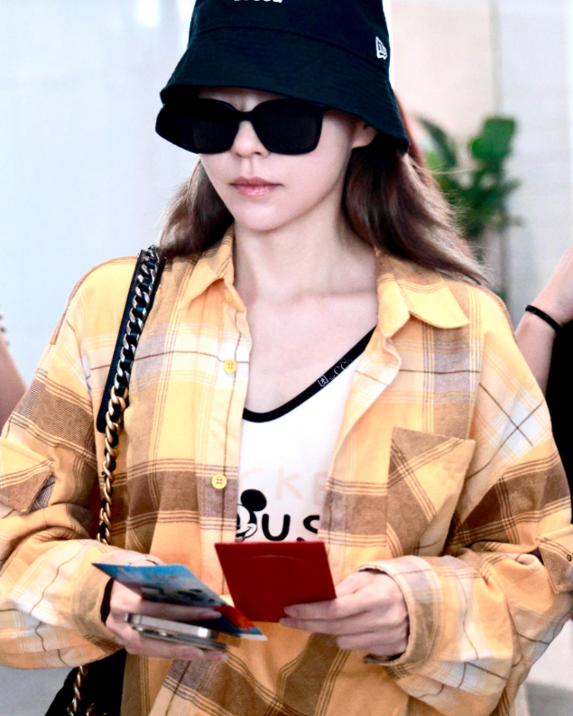 张靓颖机场私服真会穿 橙色格纹衬衫+牛仔裤,休闲随性又减龄!