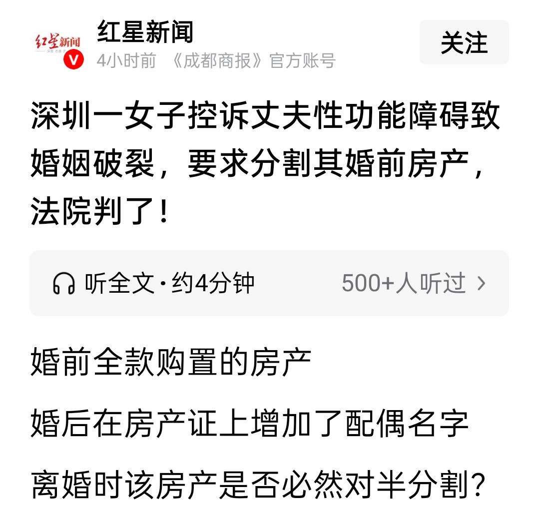 结果呢?她领了半套房,转头还是该分居分居,该起诉起诉。到了法庭上更绝,张嘴就是“你有性功能障碍,耽误我生孩子了,赔我生育权损失”。这话你们听听,像人说的吗?