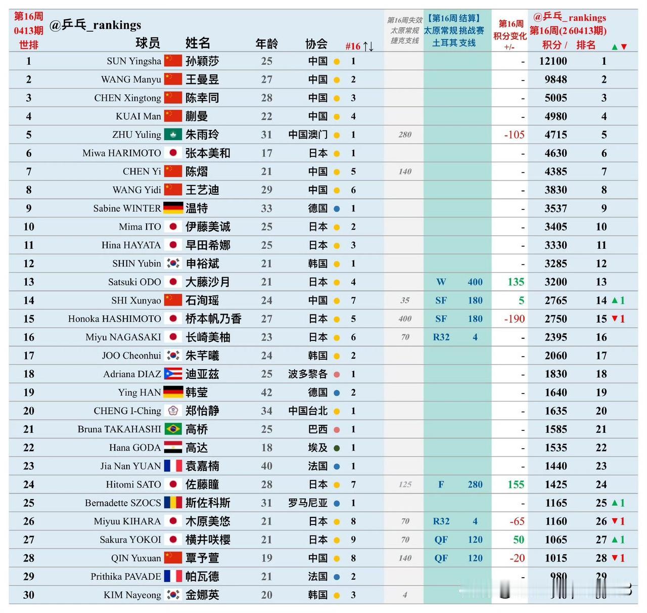 仍然是孙颖莎领衔,前四位都是中国队球员,陈熠超过王艺迪来到世排第七的位置。
