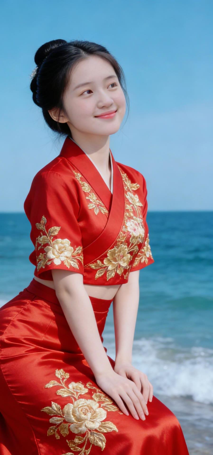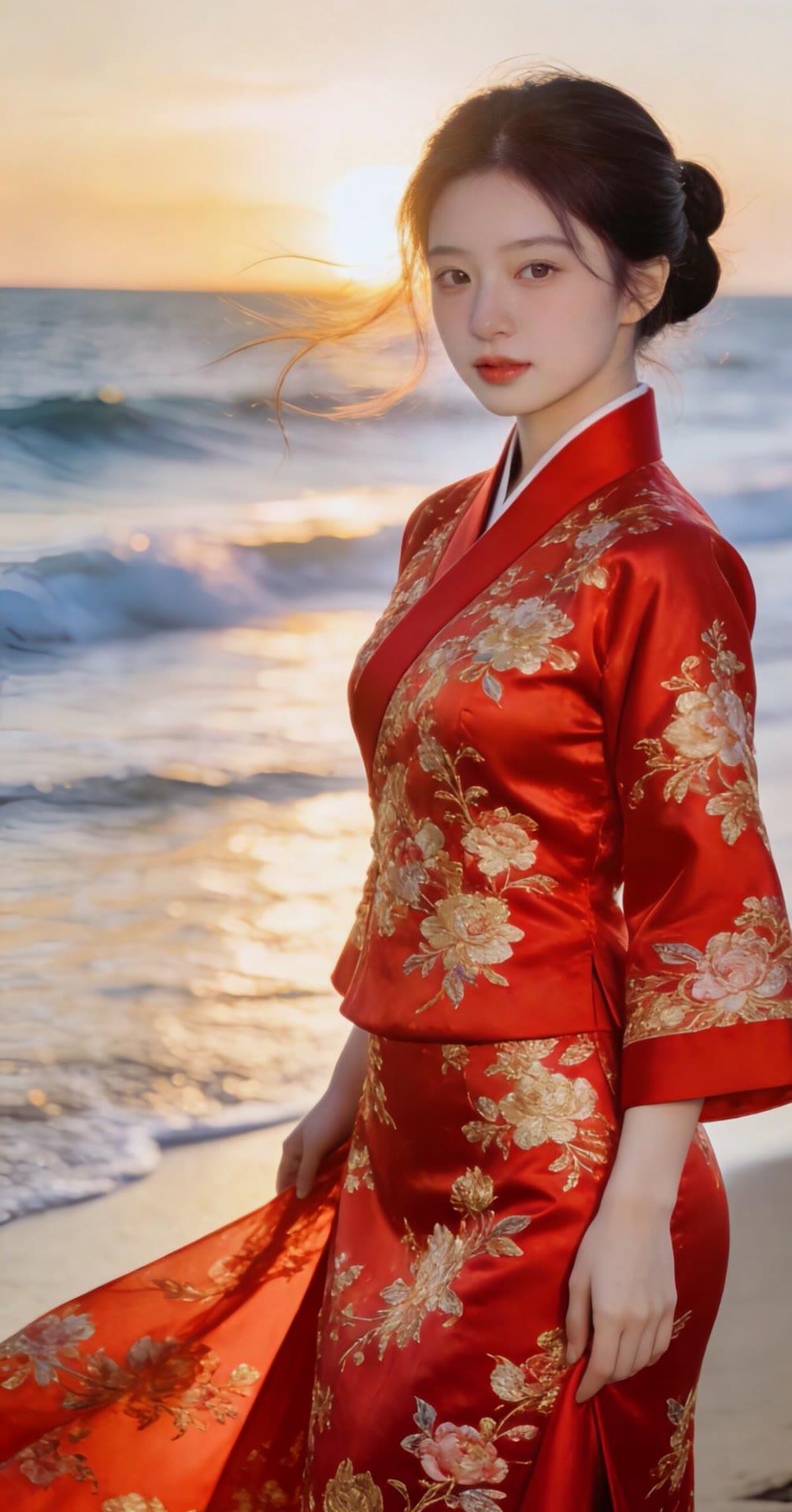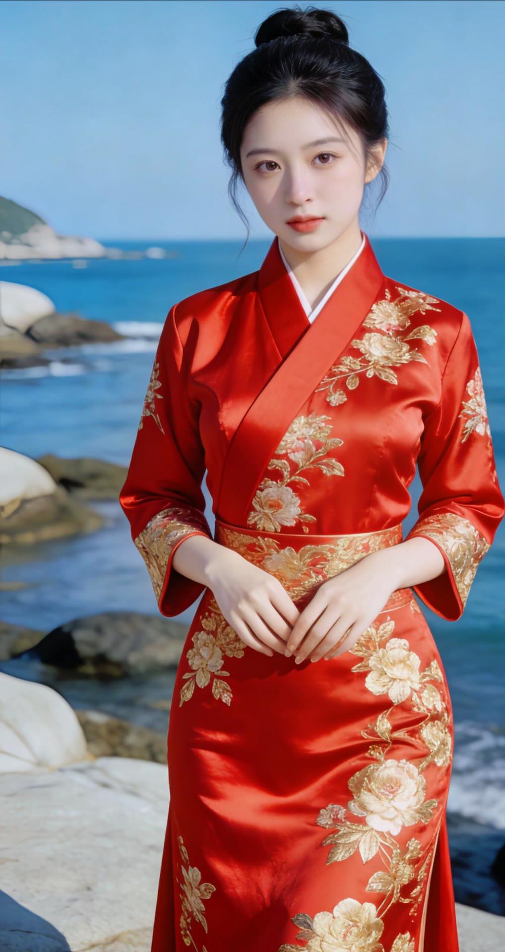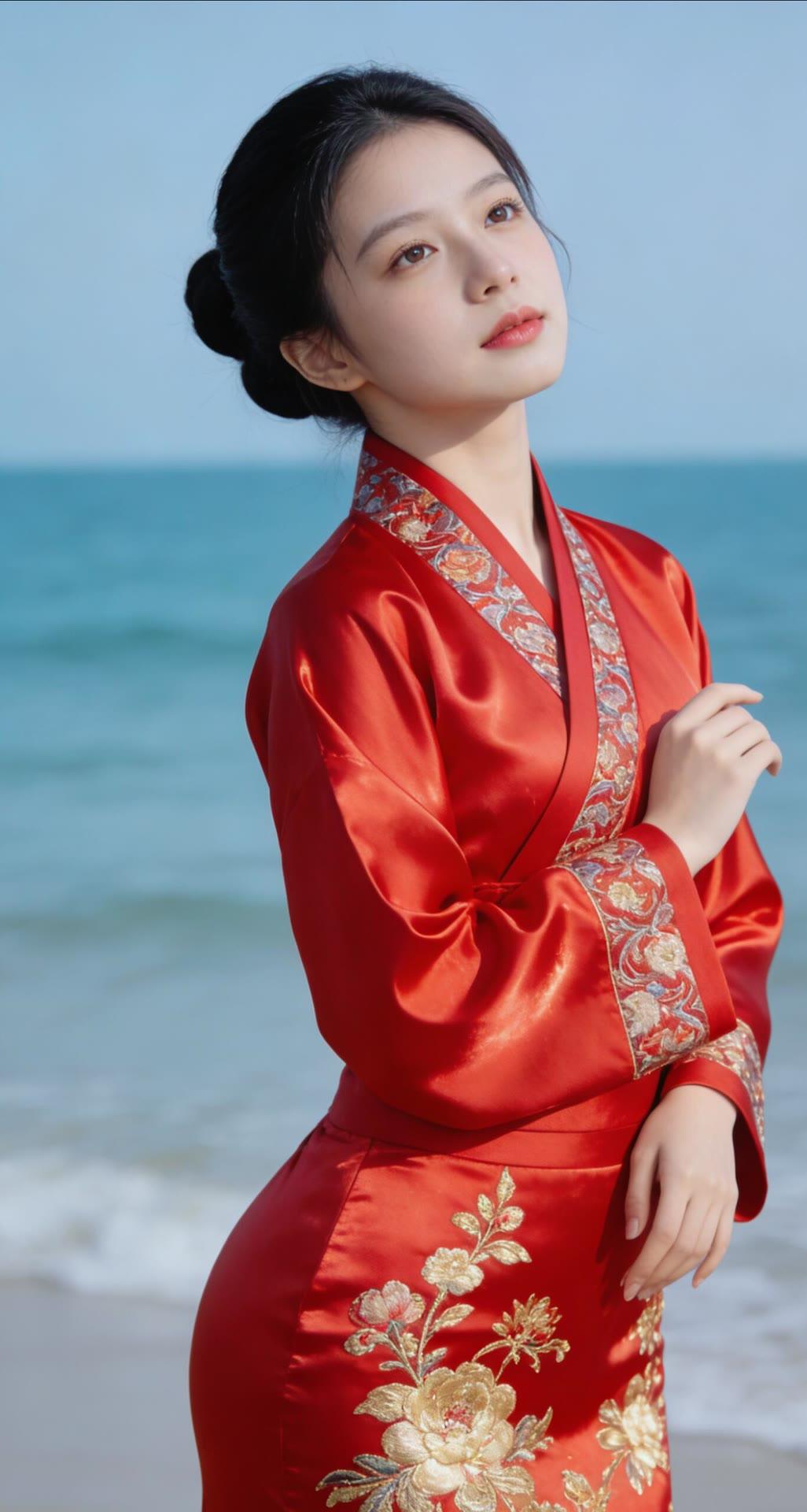 海边红衣少女,优雅动人,宛如画中仙子。