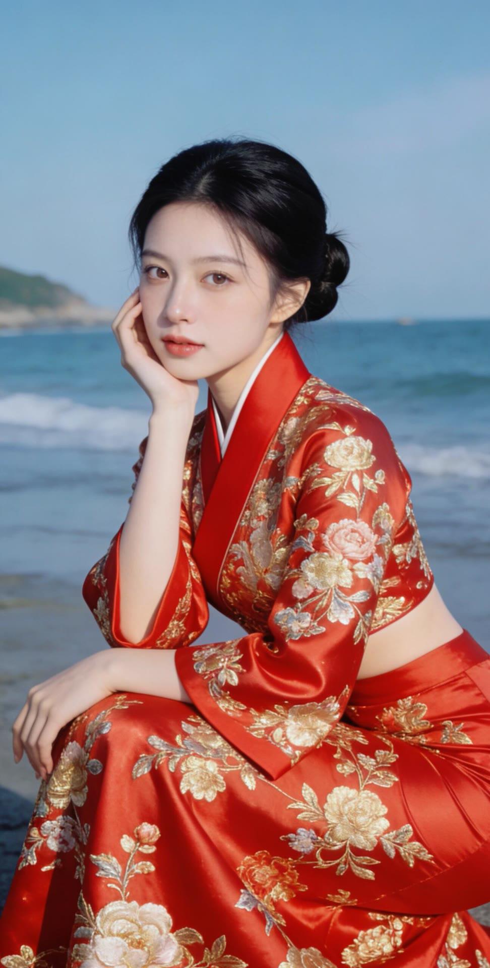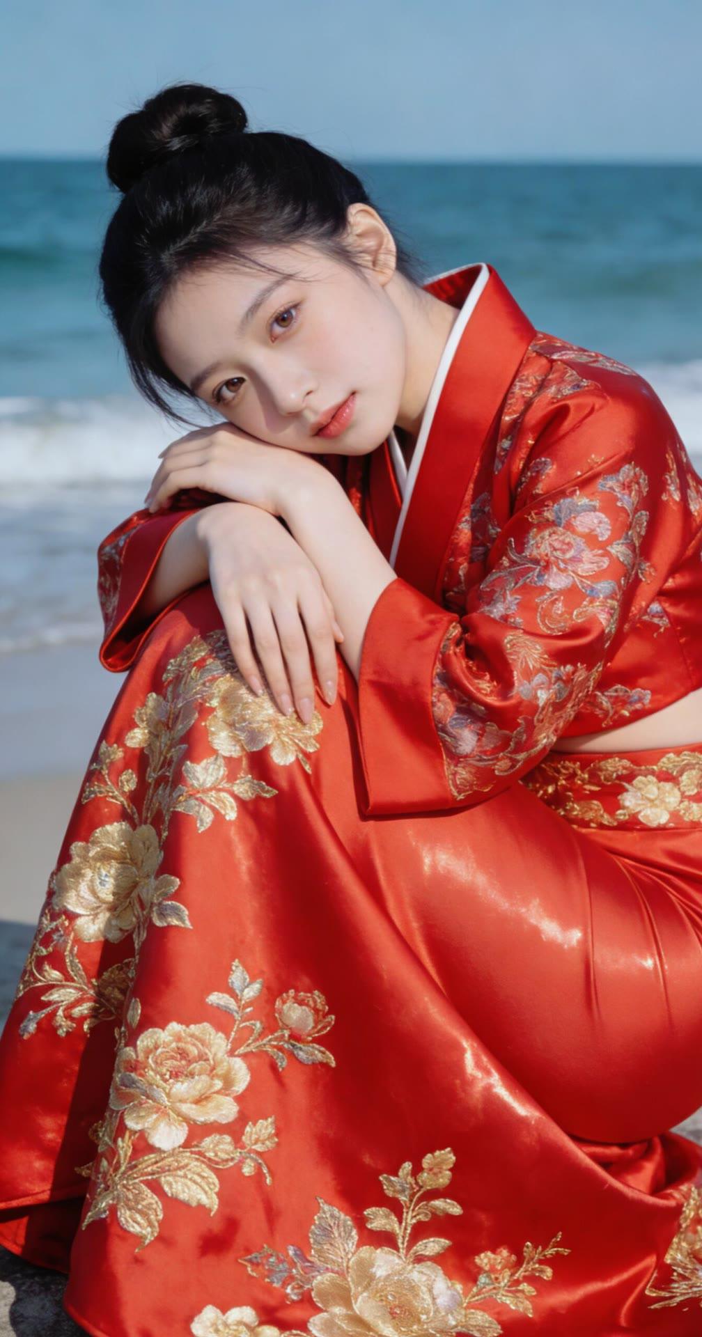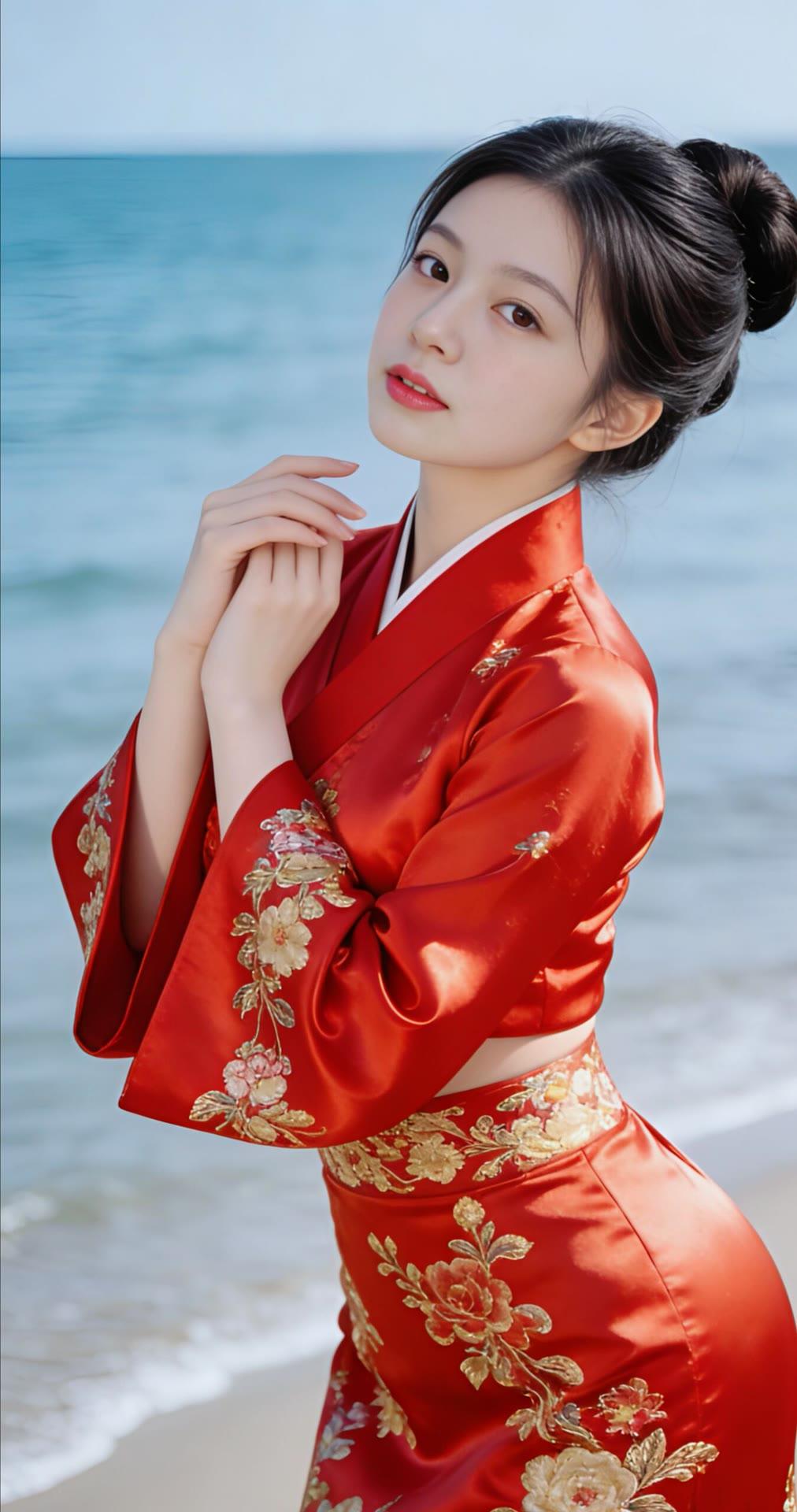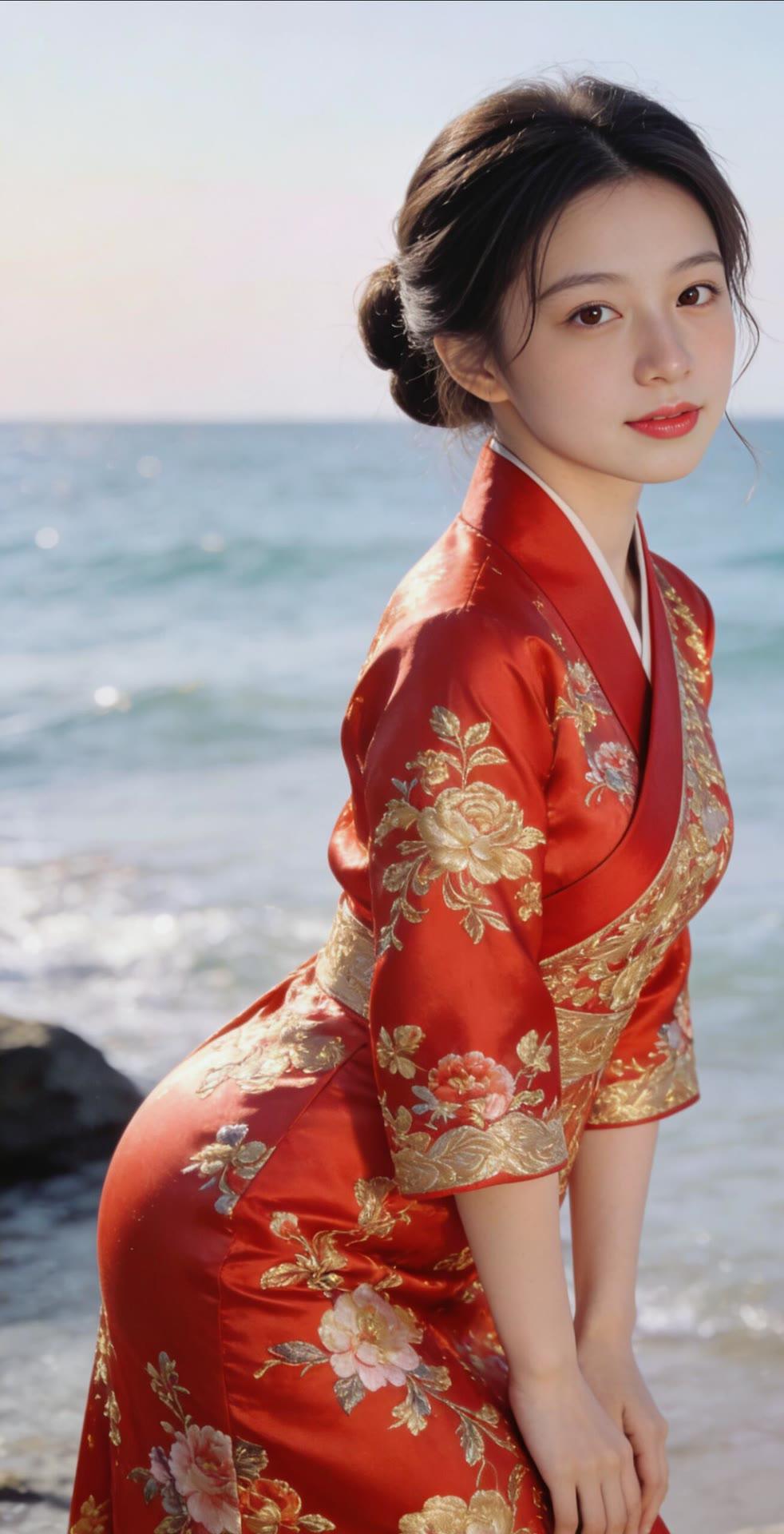 海边红衣少女,优雅动人,宛如画中仙子。
