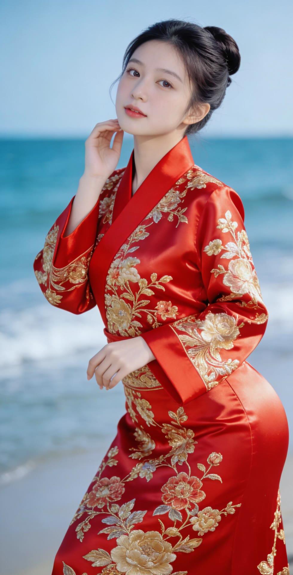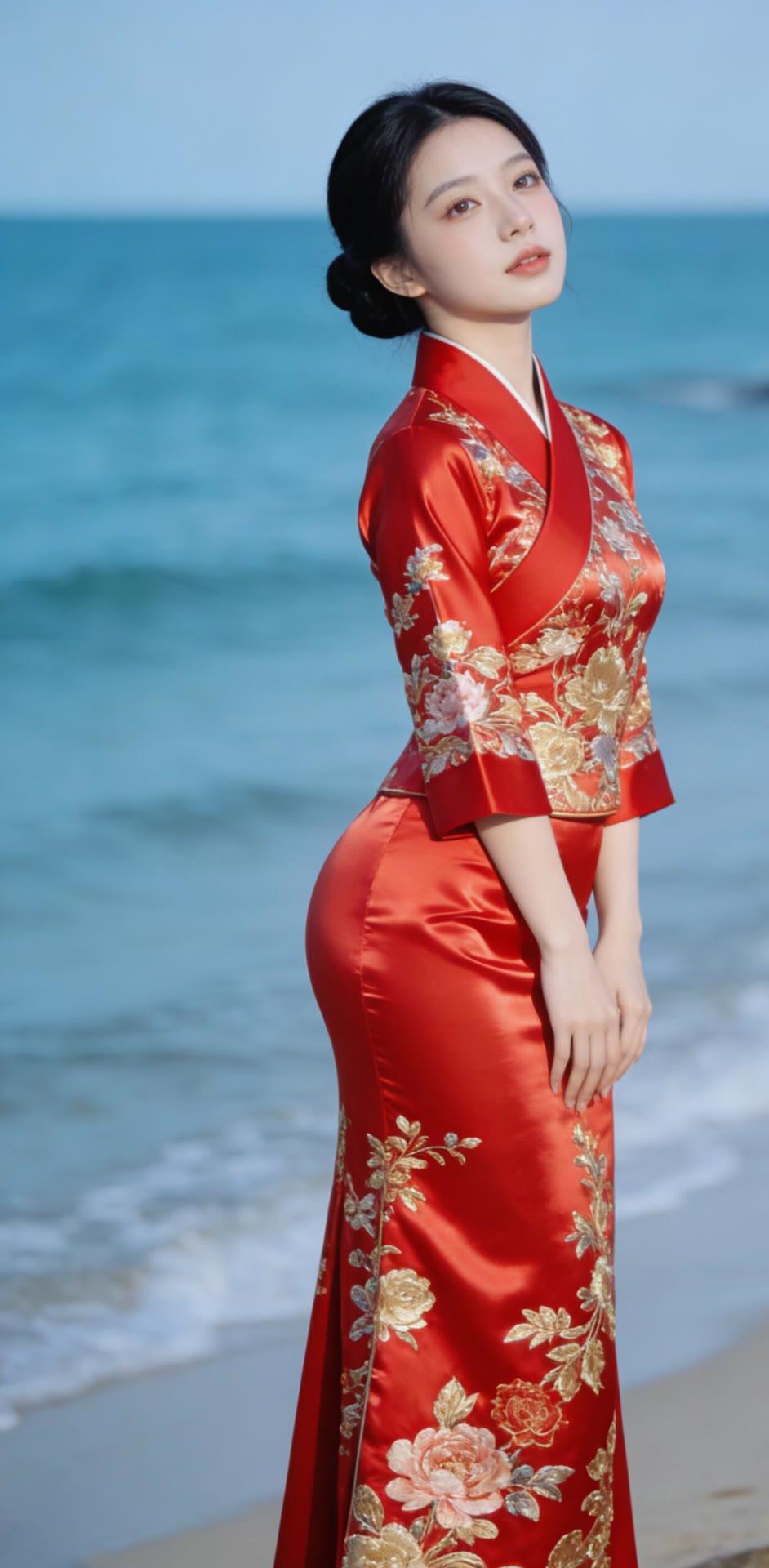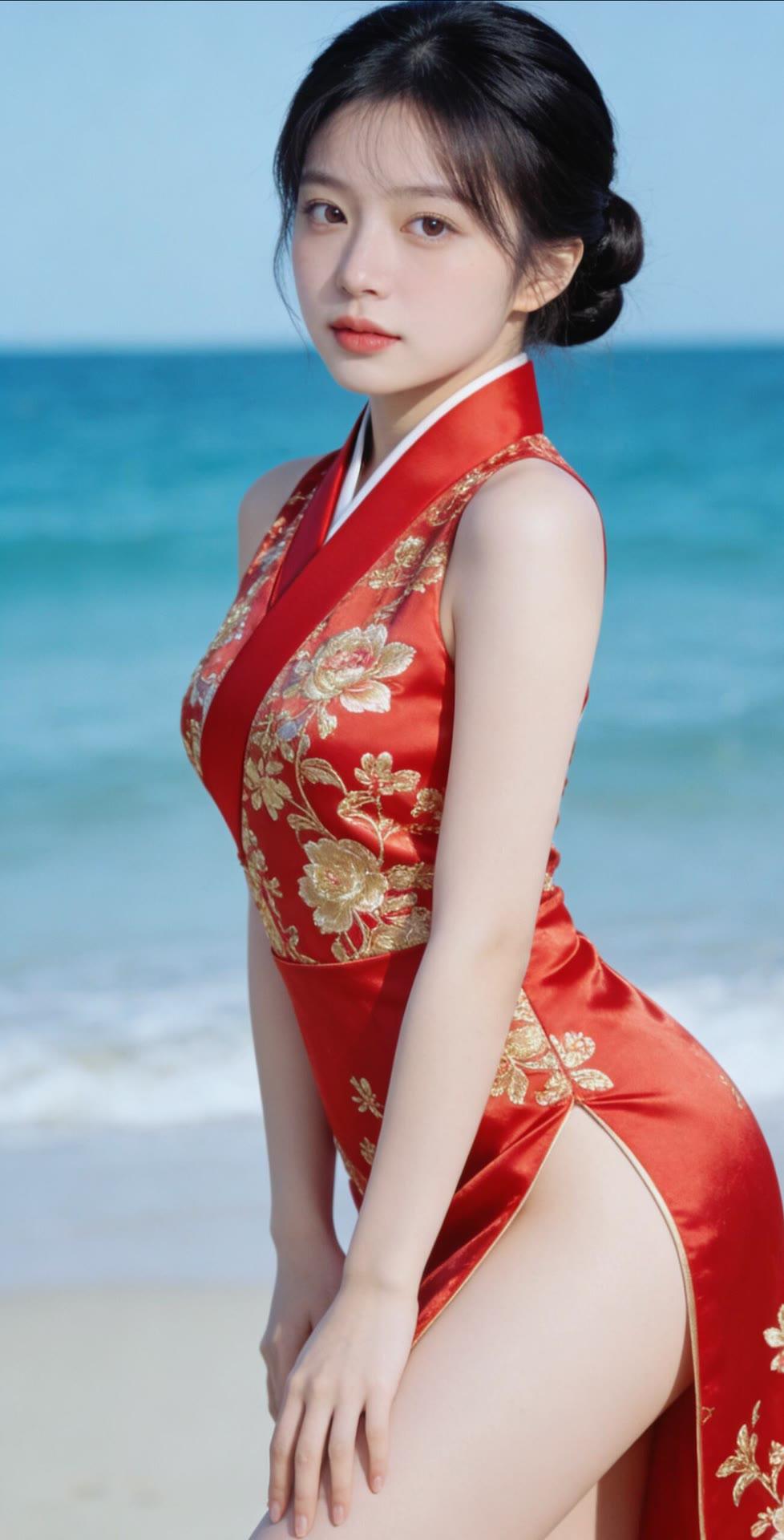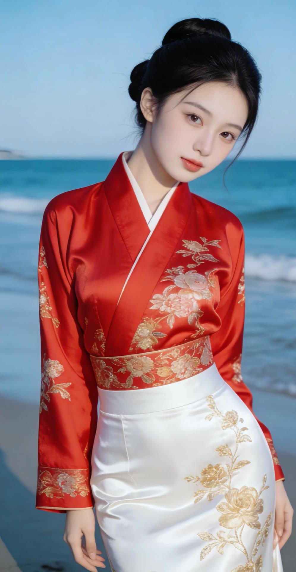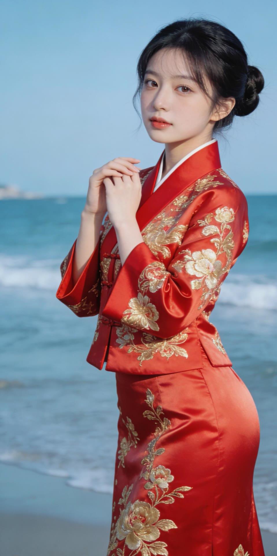 海边红衣少女,优雅动人,宛如画中仙子。