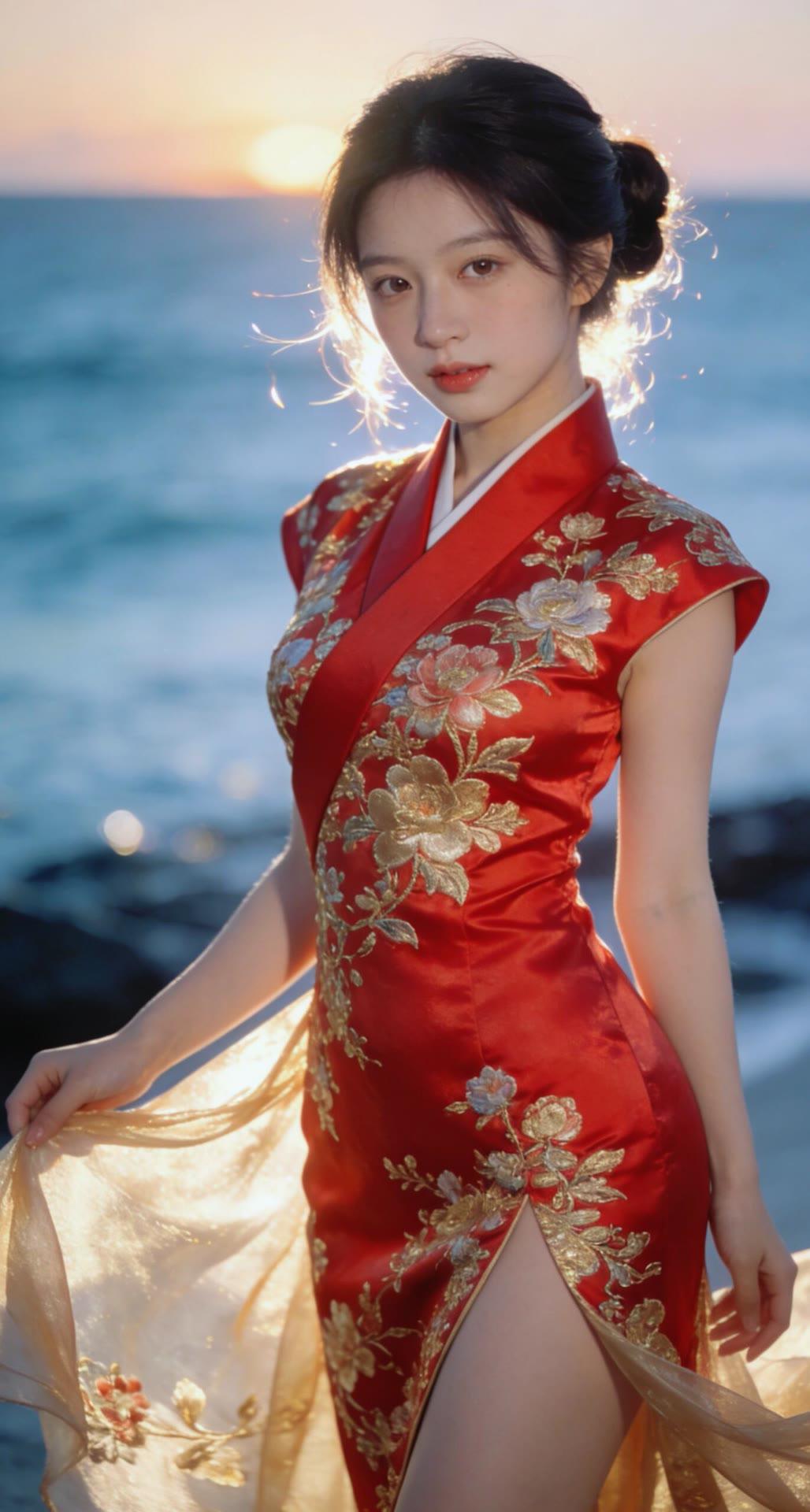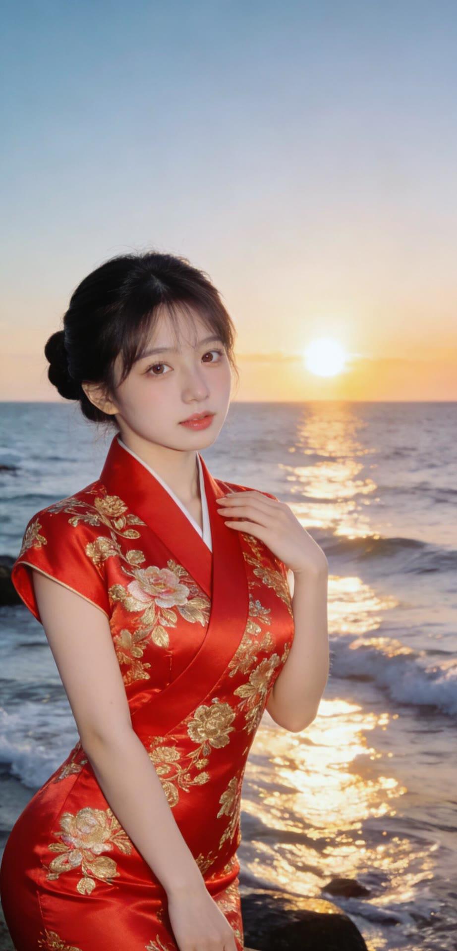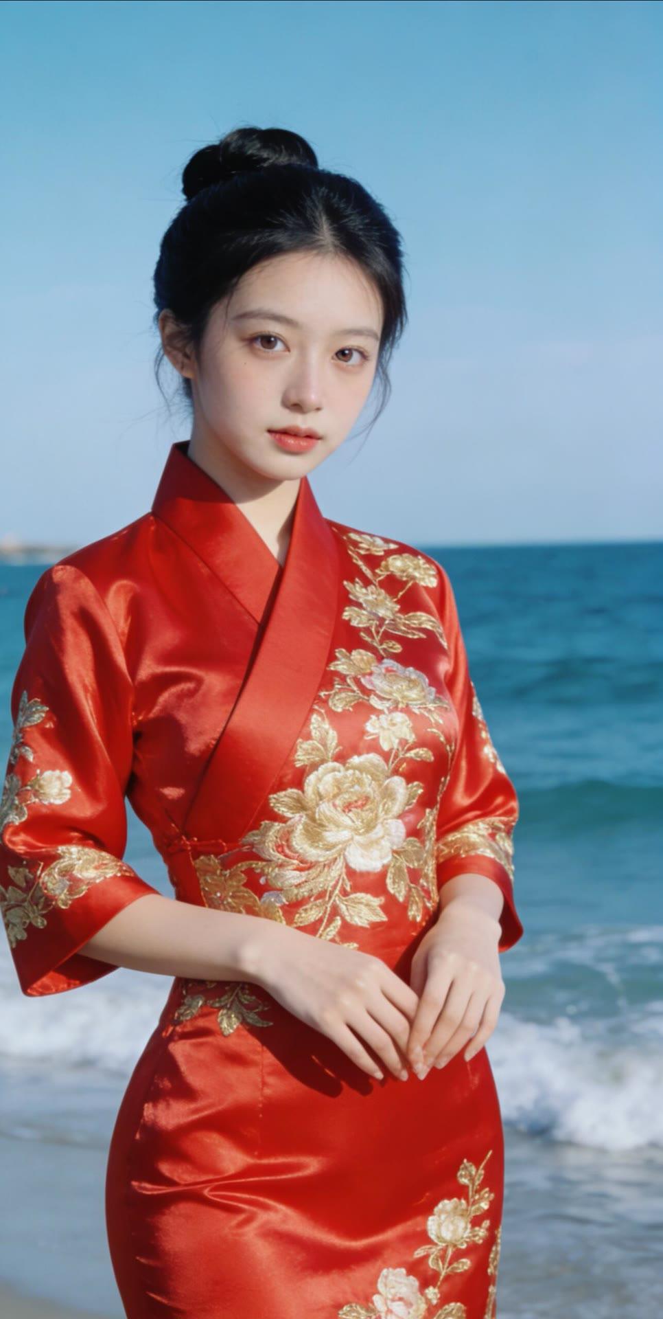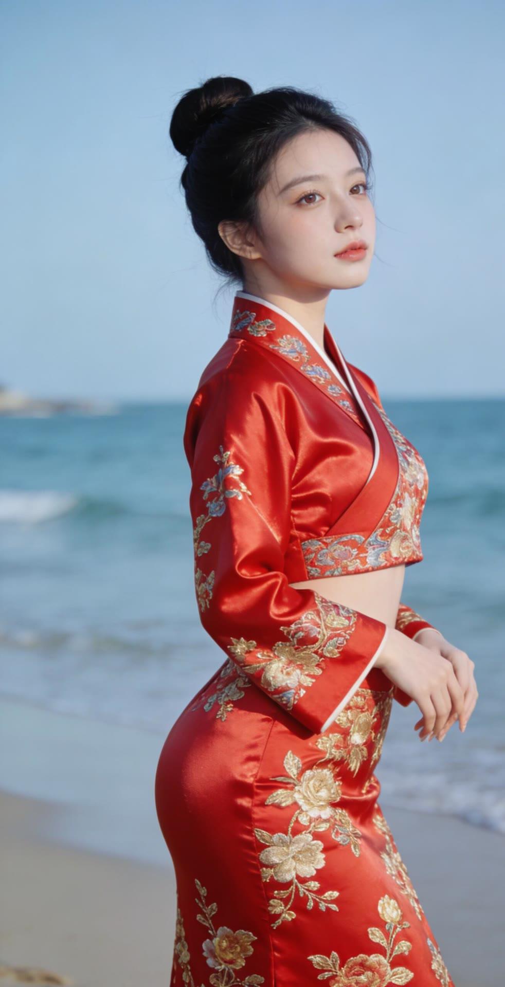 海边红衣少女,优雅动人,宛如画中仙子。