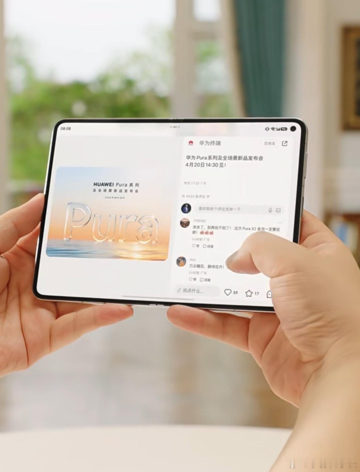 Pura X是一个非常舒服的单手握持尺寸,对,单手握持。虽然它比传统直板机宽一些,但更短,非常适合我们的巴掌尺寸,所以,它有很多忠实的粉丝,在华为大阔折信息曝光之后,有很多朋友给我留言,Pura X还有后续么?