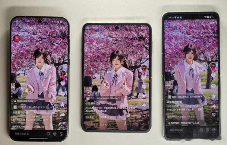 从左到右依次是传统直板机、华为Pura X阔折,以及传统的小折叠。