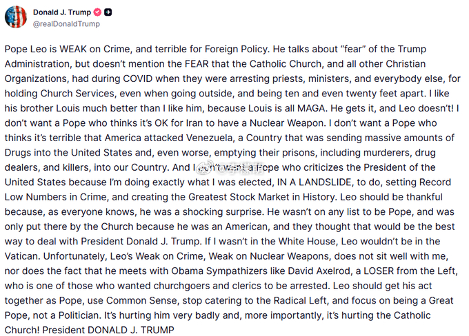 特朗普总统在Truth Social上发表了一篇侮辱教皇利奥十四世的帖子