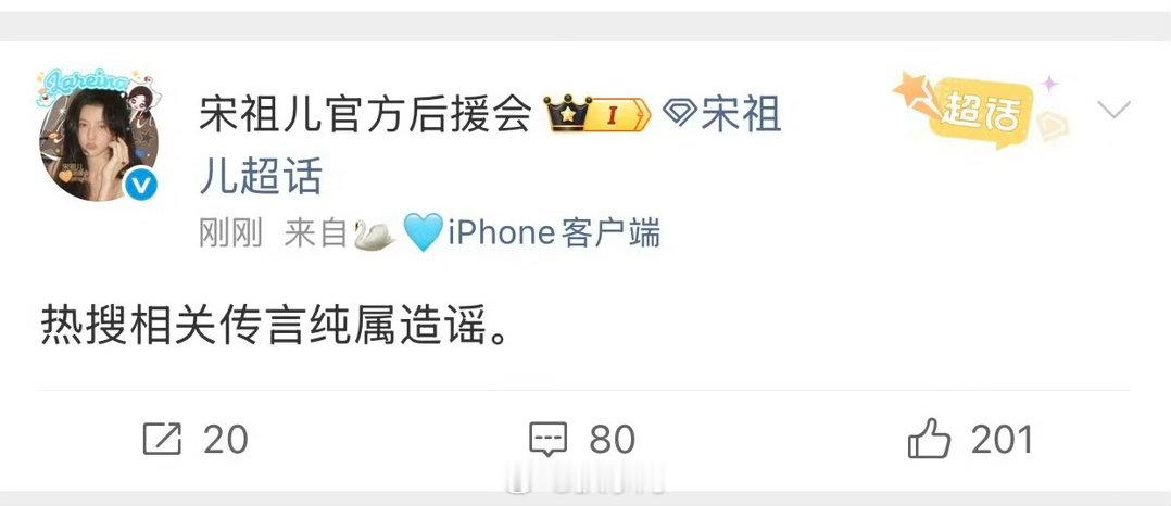 宋祖儿后援会辟谣 又是心疼宋祖儿的一天,宋祖儿在《司宫令》认真拍戏,没想到都能被人cue。现在宋祖儿后援会辟谣了,否认小号传言,宋祖儿和刘宇宁本身就是合作伙伴,不少网友期待能早日二搭,希望祖鹅和宇哥不会被影响到啊!宋祖儿后援会否认小号传言