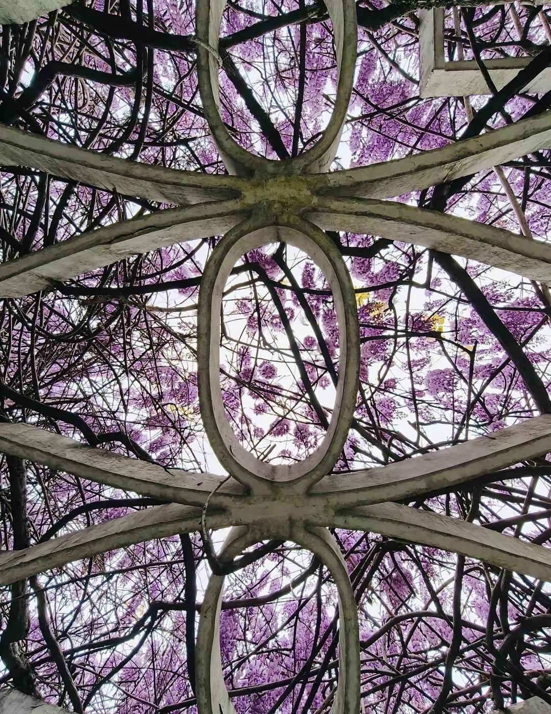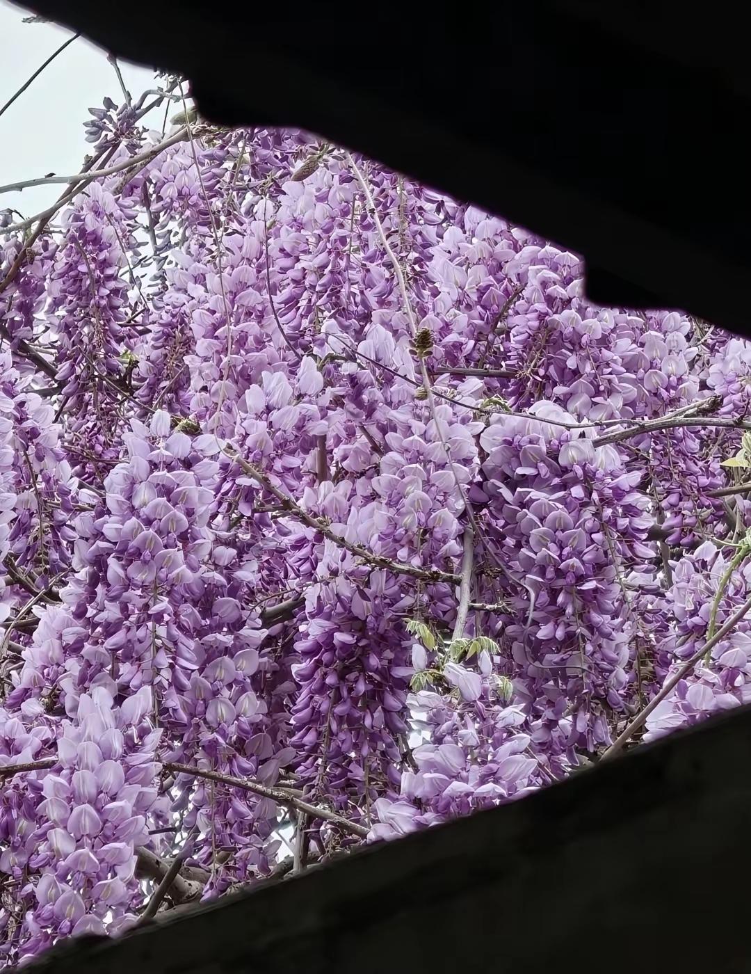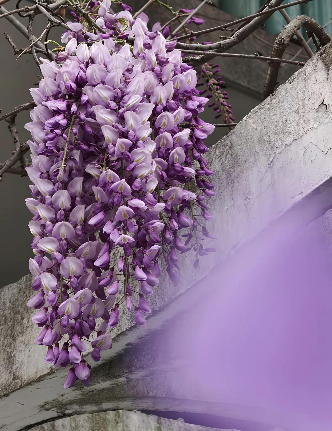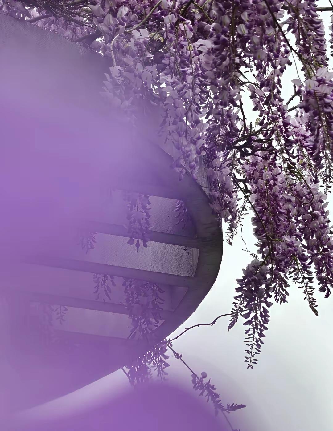 紫藤花开如云霞,灿如紫瀑,芳华璀璨(将紫藤花比作云霞和瀑布,突出其色彩的绚丽与姿态的灵动,营造出如梦似幻的意境。)