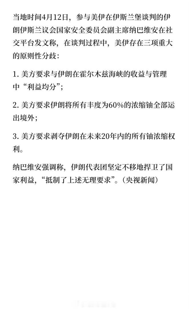 伊朗曝美方要均分霍尔木兹收益当地时间4月12日,参与美伊在伊斯兰堡谈判的伊朗伊斯兰议会国家安全委员会副主席纳巴维安在社交平台发文称,在谈判过程中,美伊存在三项重大的原则性分歧:1. 美方要求与伊朗在霍尔木兹海峡的收益与管理中“利益均分”;2. 美方要求伊朗将所有丰度为60%的浓缩铀全部运出境外;3. 美方要求剥夺伊朗在未来20年内的所有铀浓缩权利。纳巴维安强调称,伊朗代表团坚定不移地捍卫了国家利益,“抵制了上述无理要求”。