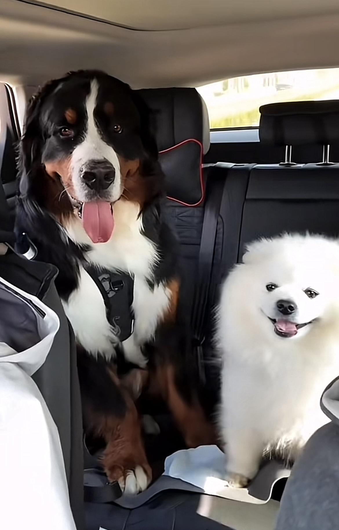 啾啾的主人拉了满满一车狗粮,后备箱都塞不下了,啾啾和淘淘似乎明白自己要去做有意义的事情,乖乖地坐在车子后排,跟主人一起出发。