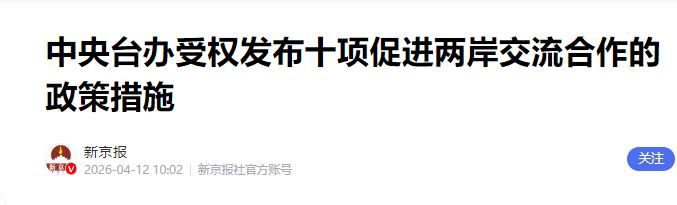 信息来源:《中央台办受权发布十项促进两岸交流合作的政策措施》,新京报,2026年4月12日。