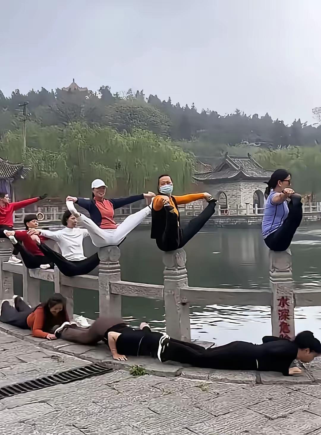 景区湖边的栏杆上,十几位大妈直接把危险地段当成了表演台,