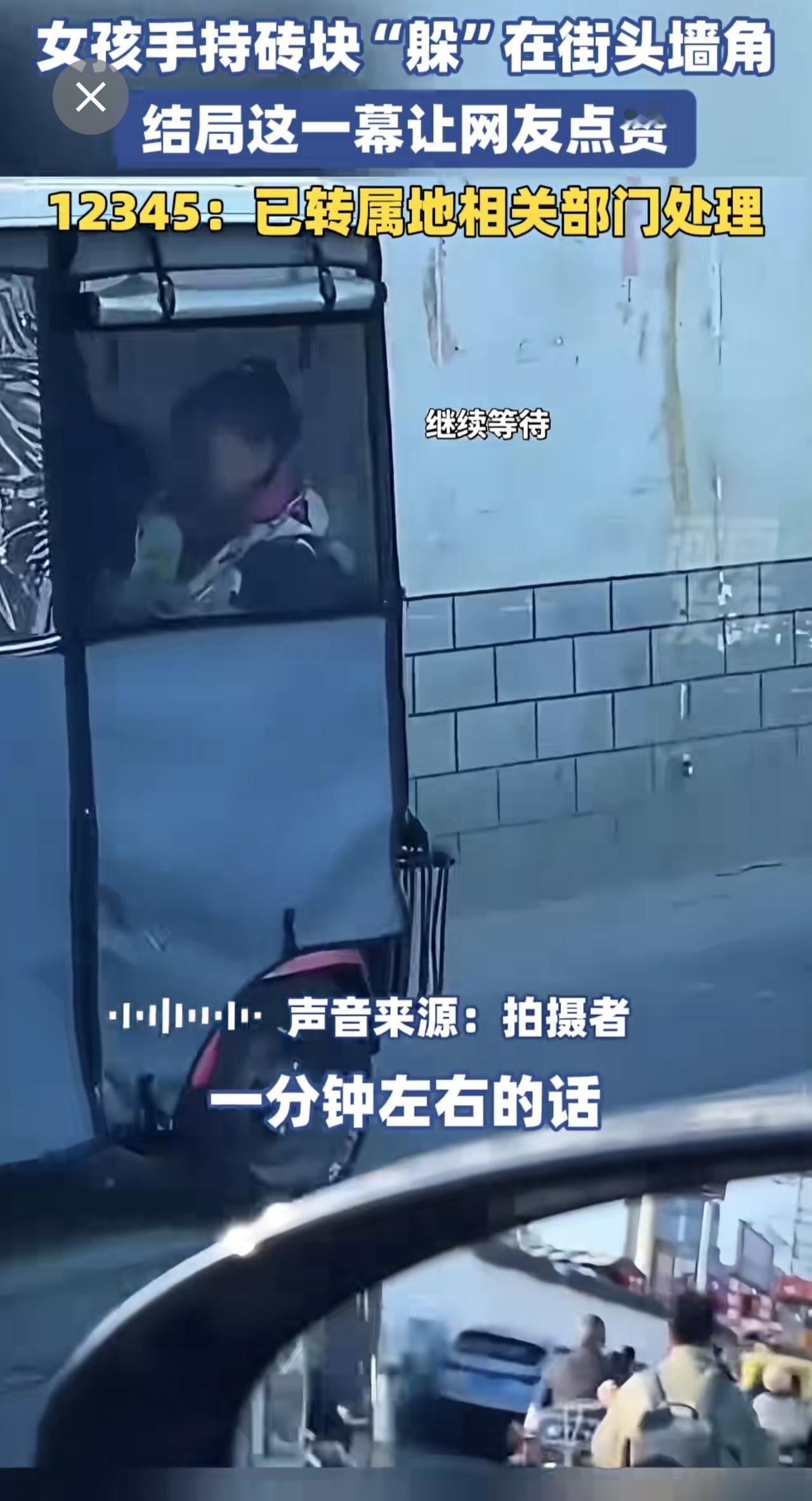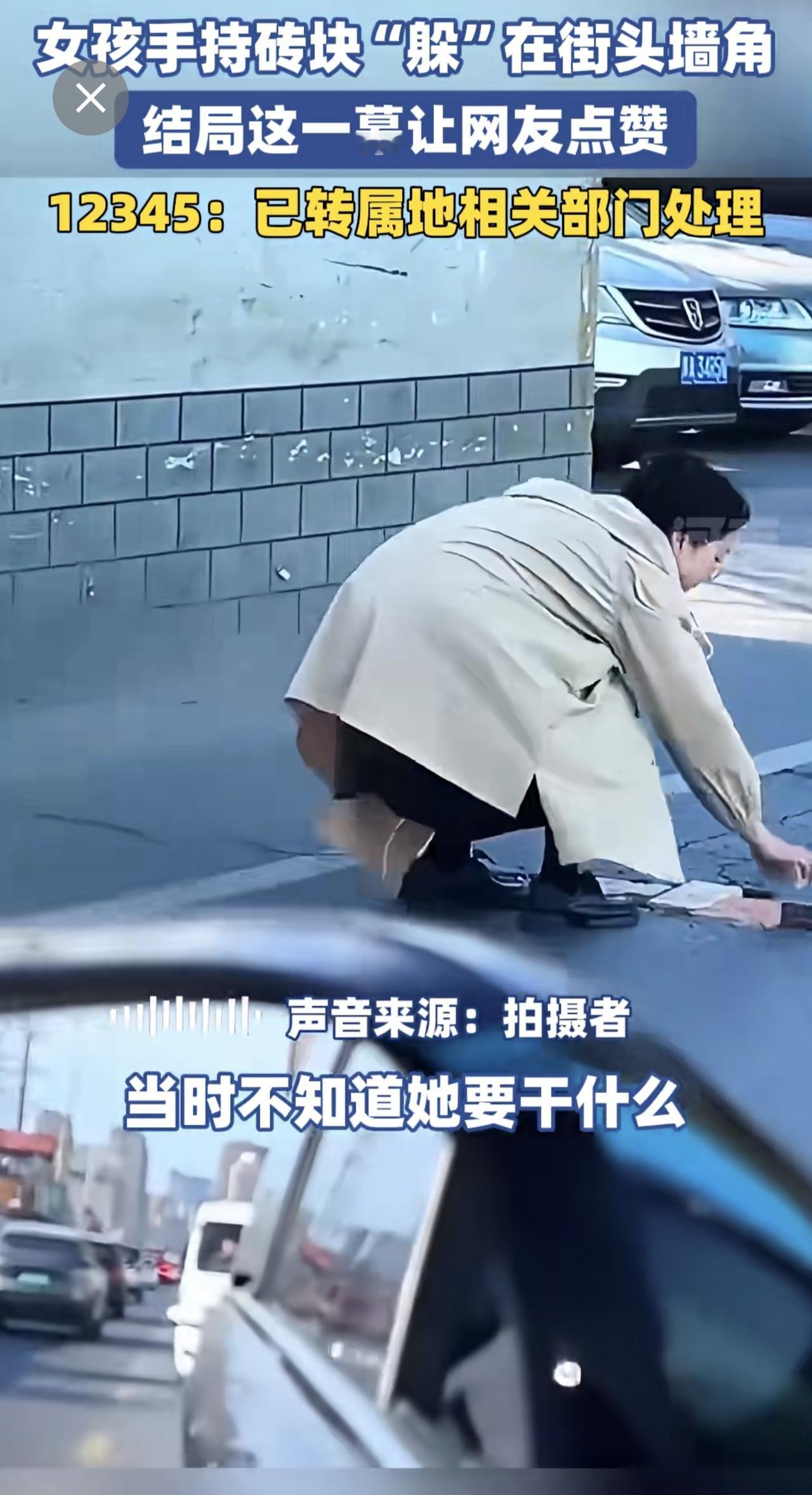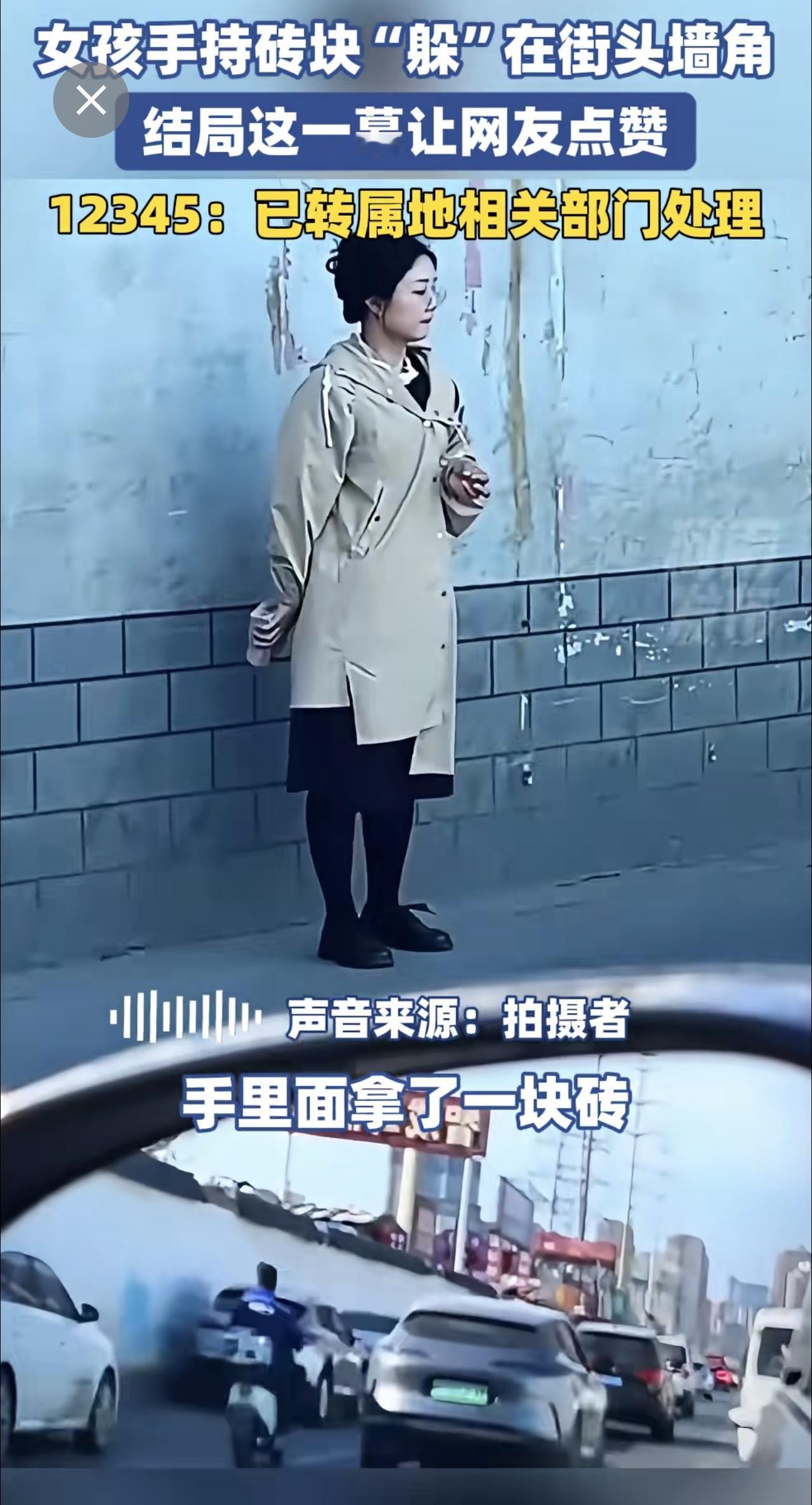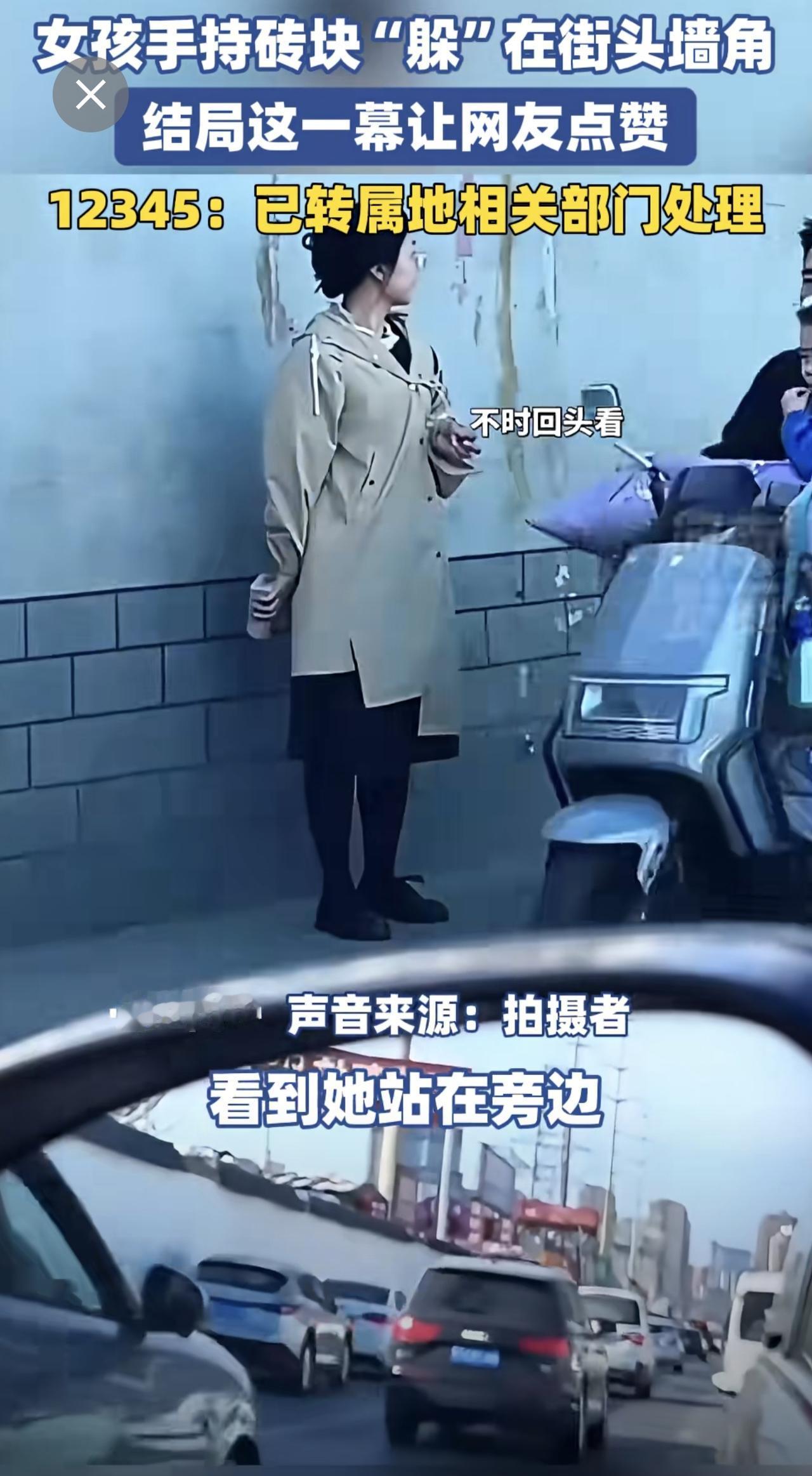 女孩手持砖块“躲”在街头墙角,结局这一幕让网友点赞。12345:已转属地相关部门