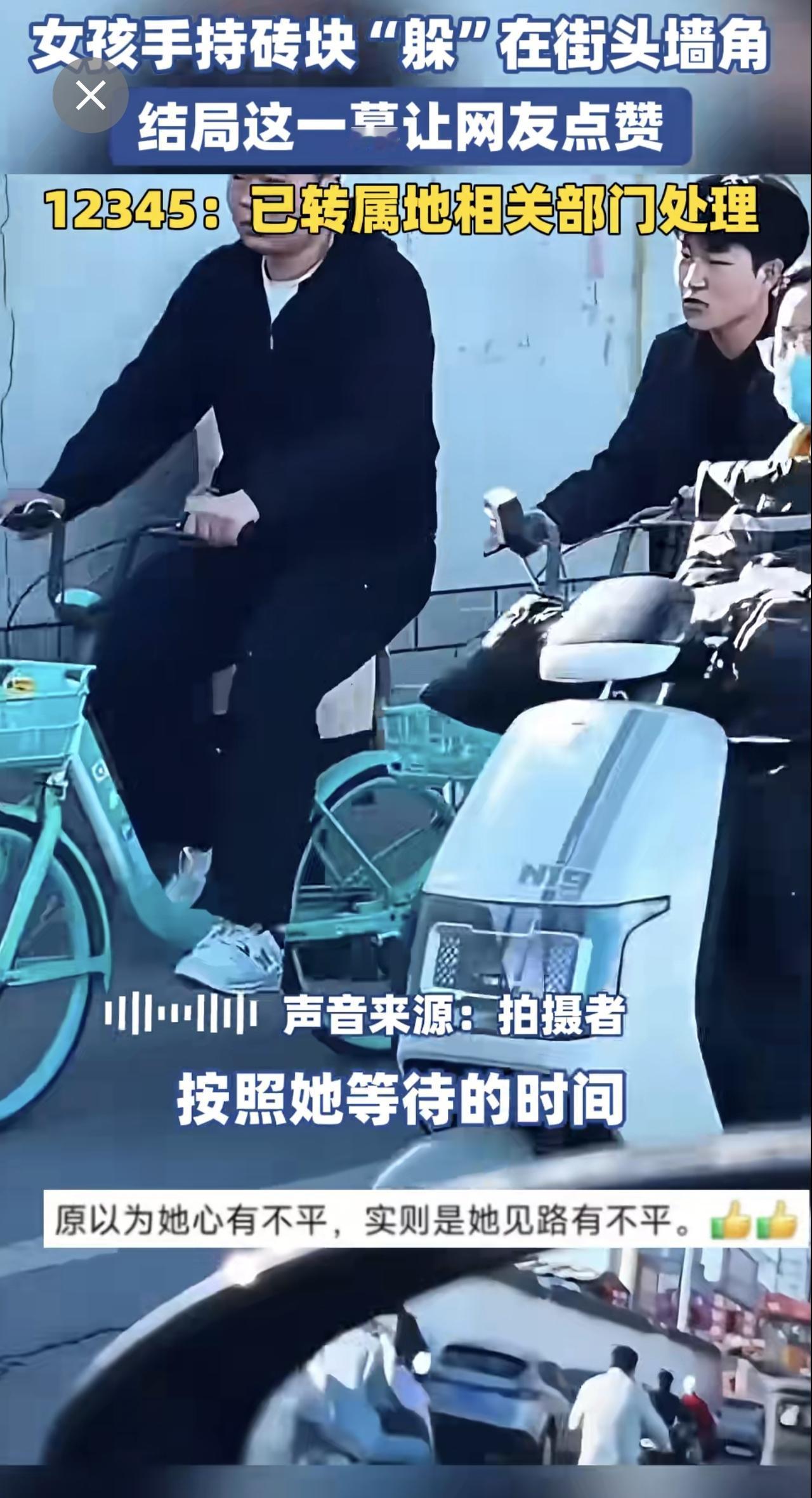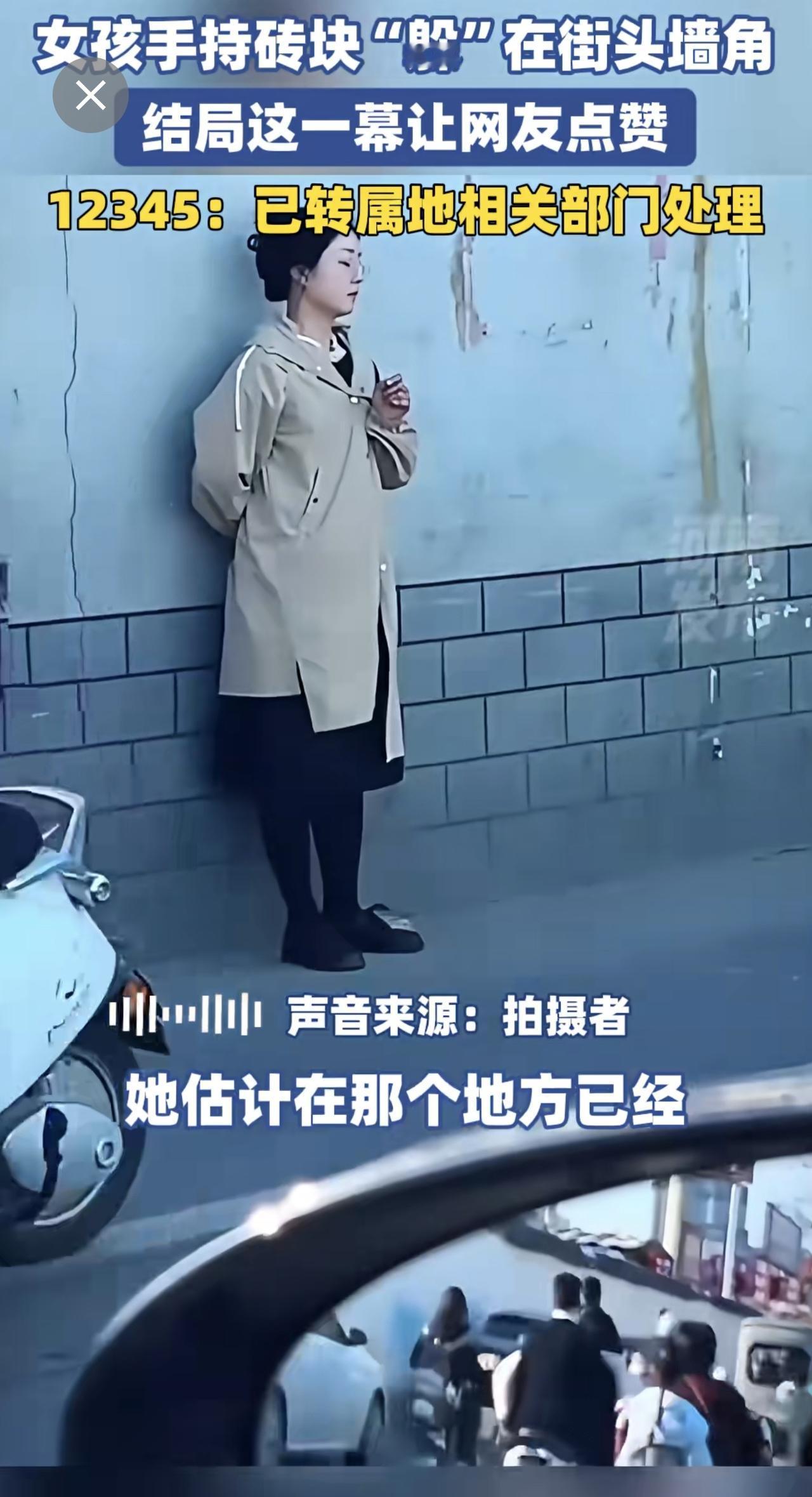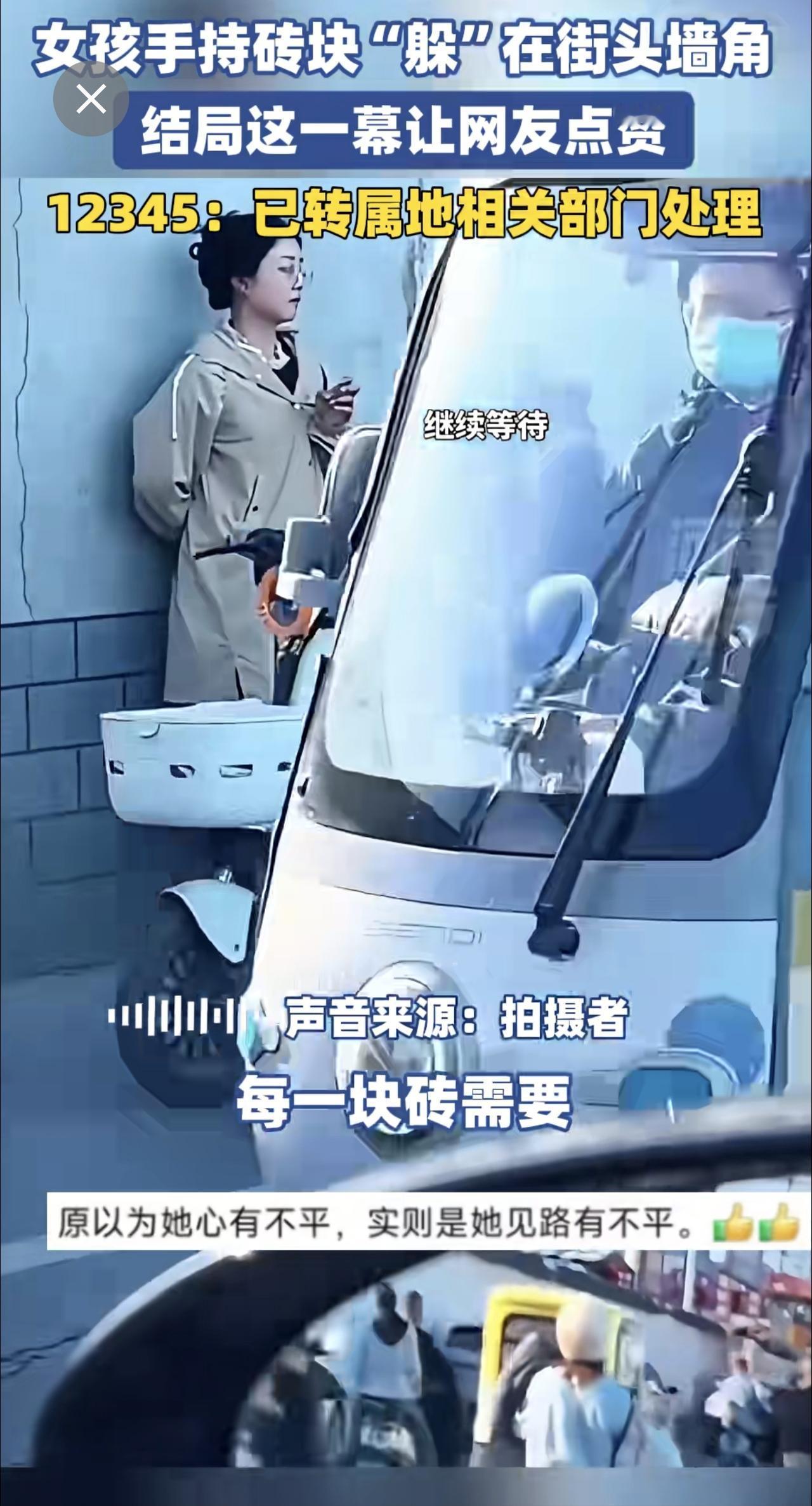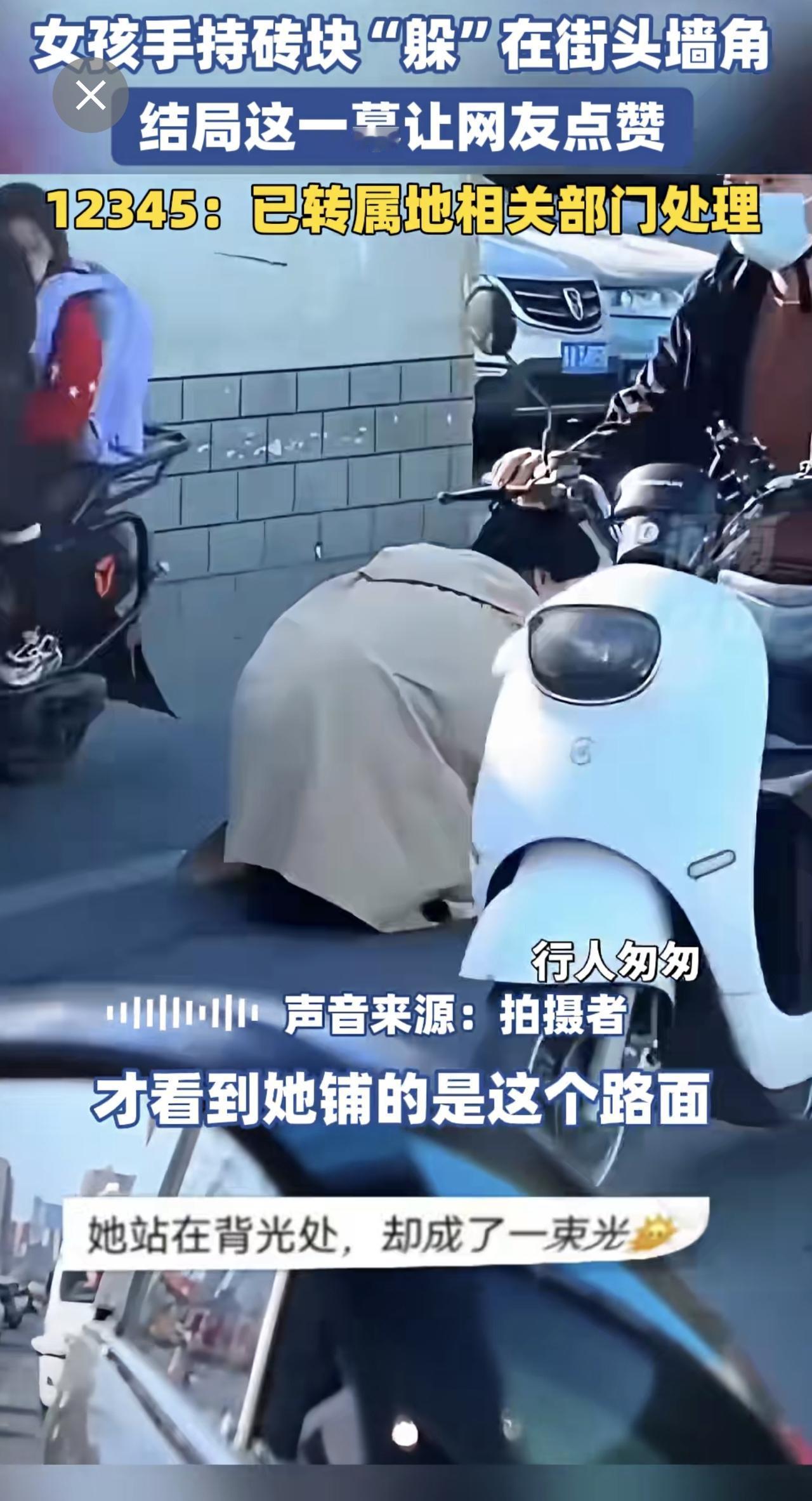 女孩手持砖块“躲”在街头墙角,结局这一幕让网友点赞。12345:已转属地相关部门