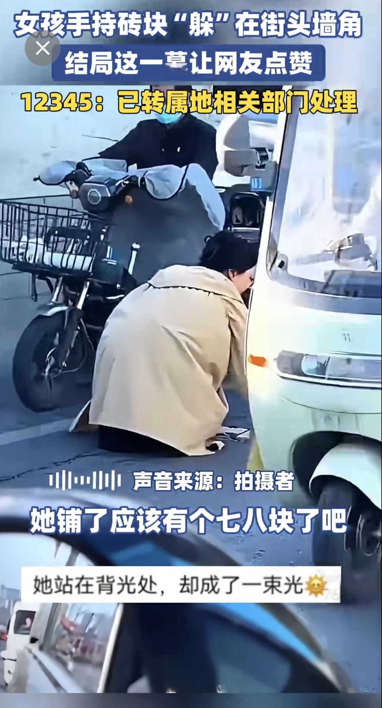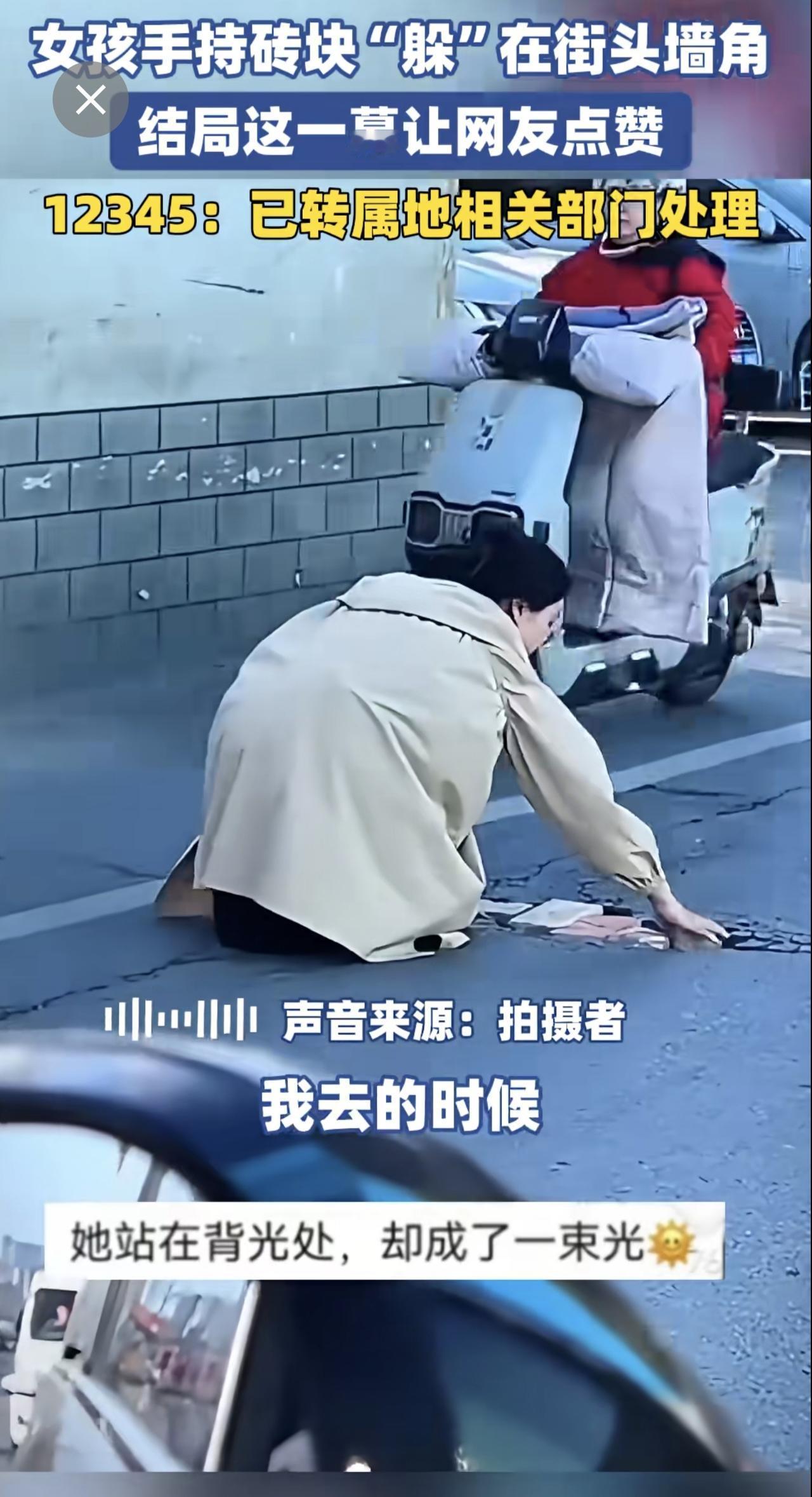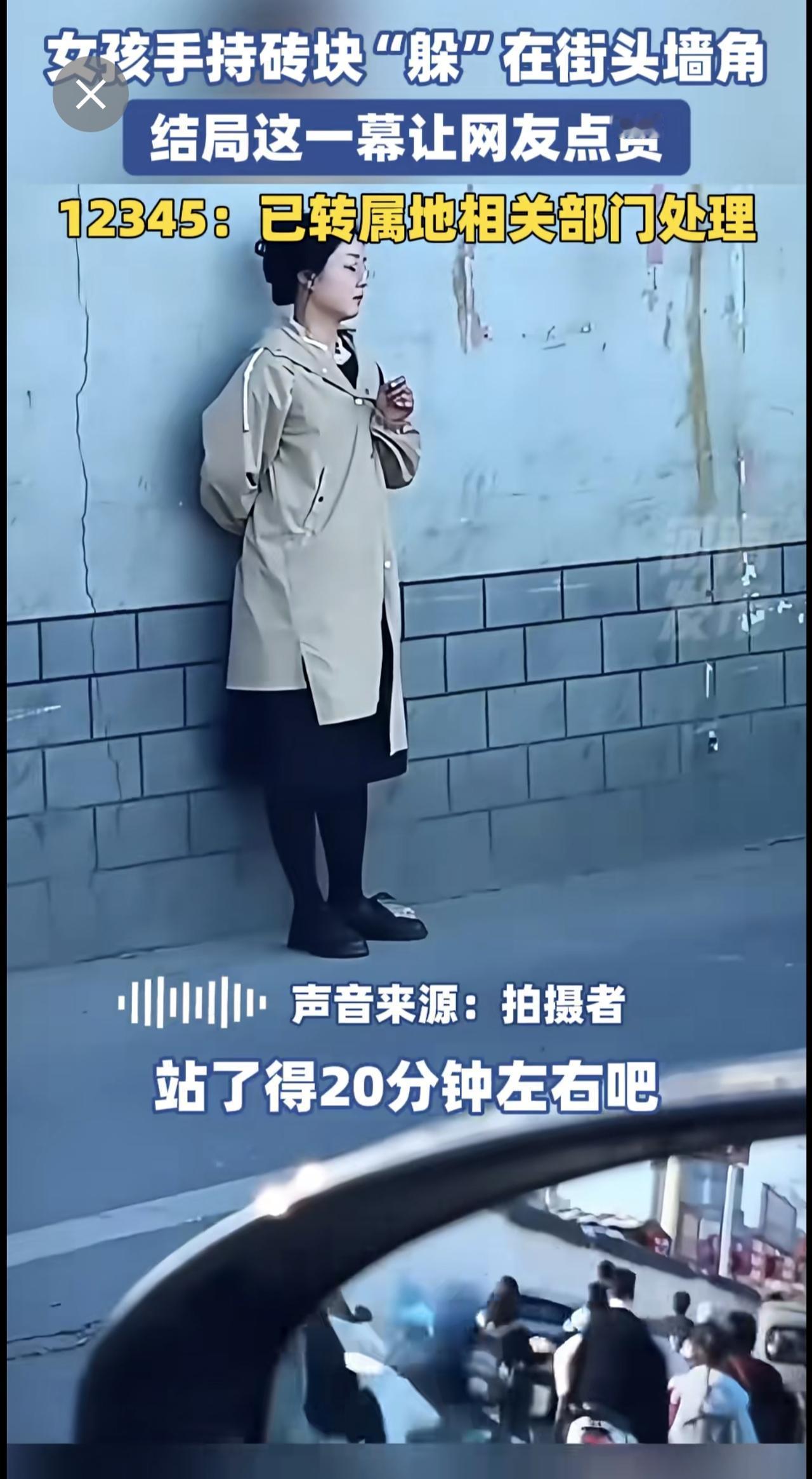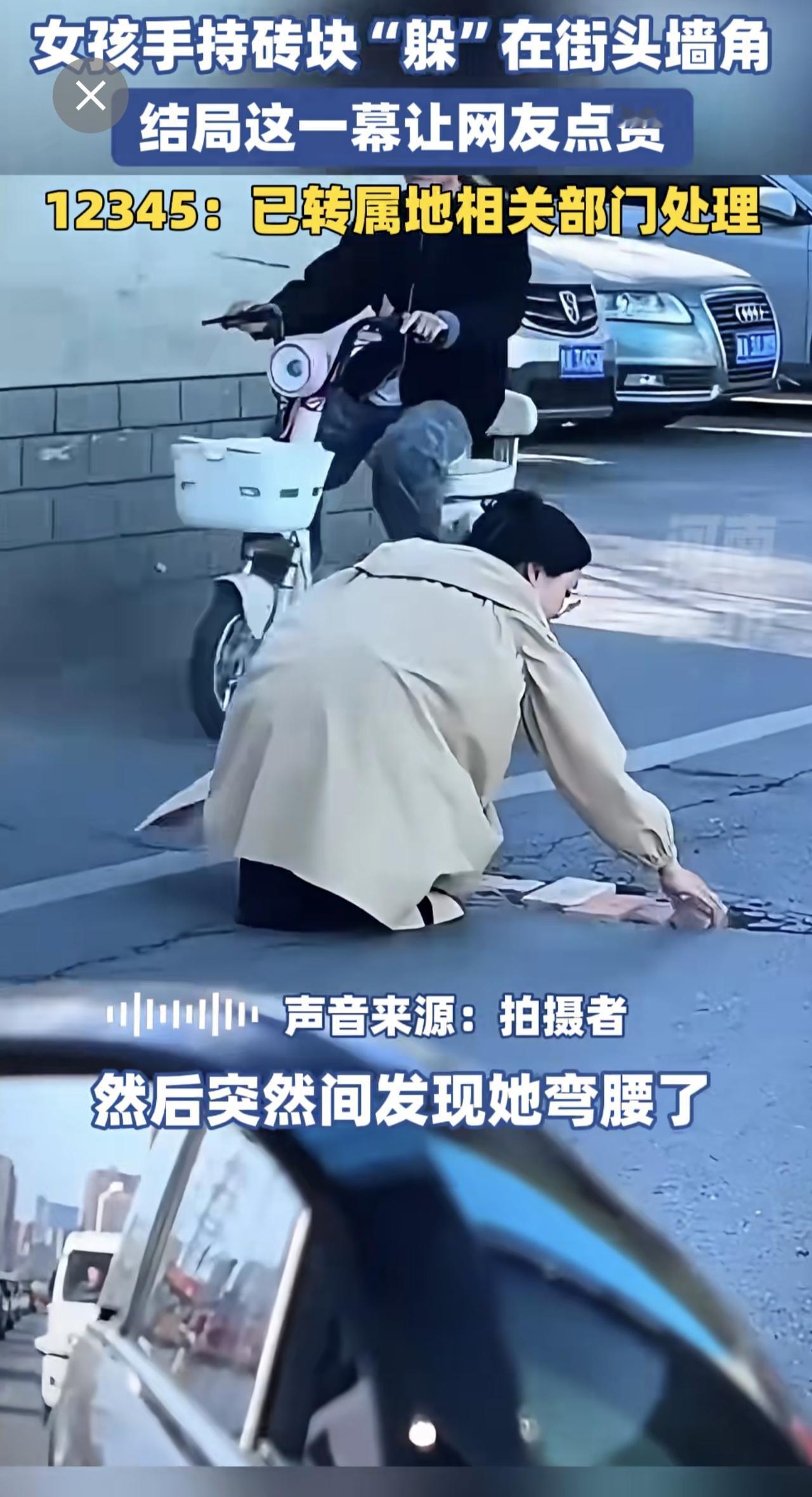 女孩手持砖块“躲”在街头墙角,结局这一幕让网友点赞。12345:已转属地相关部门
