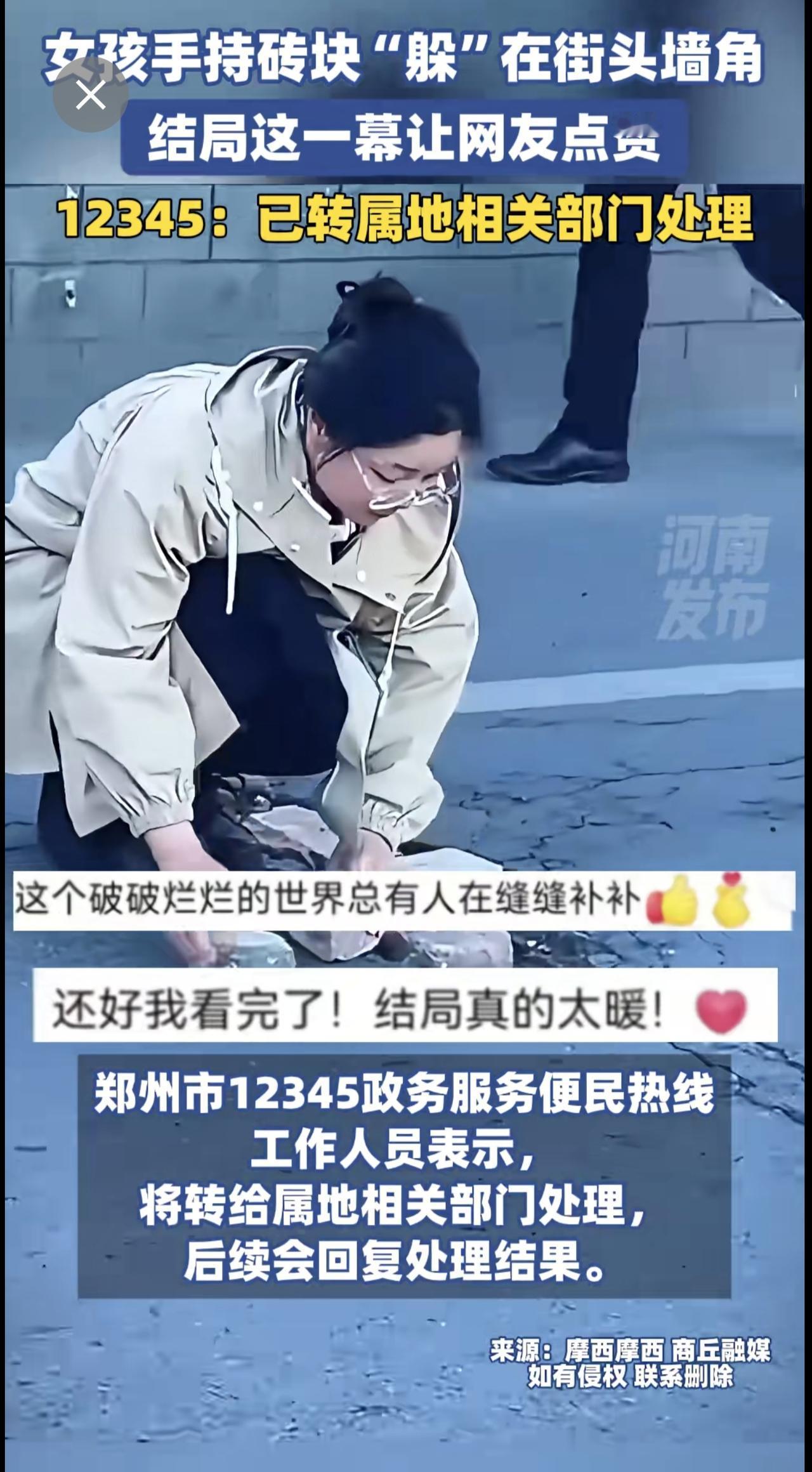 女孩手持砖块“躲”在街头墙角,结局这一幕让网友点赞。12345:已转属地相关部门处理。(来源:河南发布)
