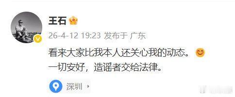 紧接着王石两口子就在网络上回应:没有被抓,一切安好,要让造谣者付出代价,并且已在报案的路上。